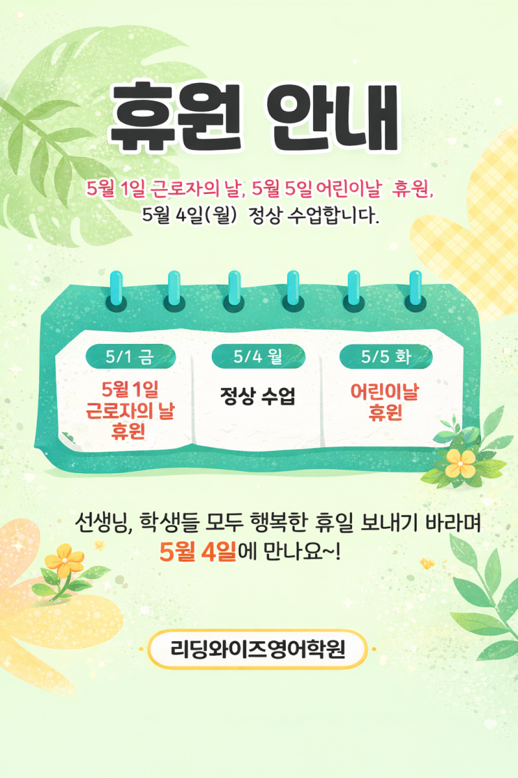 안녕하세요. 리딩와이즈영어학원 김은정 원장입니다. 벌써 5월을 앞두고 있네요. 아이들에게는 더없이 설레는 달, 그리고 가족에게는 조금 더 함께할 수 있는 시간이 생기는 달이기도 합니다. 그래서 오늘은 다가올 5월 수업 일정을 미리 안내드리려고 합니다. ✔ 5월 1일(금) 근로자의 날 → 휴원 ✔ 5월 4일(월) → 정상 수업 ✔ 5월 5일(화) 어린이날 → 휴원 짧은 일정이지만 미리 알고 계시면 좋을 것 같아 조금 일찍 글로 남겨드립니다 5월은 참 좋은 달입니다. 아이들은 마음껏 웃고, 뛰어놀고, 좋아하는 것들을 충분히 누릴 수 있는 시간이 되었으면 좋겠고, 부모님들께는 아이와 함께하는 시간이 조금 더 여유롭고 따뜻하게 남는 달....... <img src="https://blogthumb.pstatic.net/MjAyNjA0MjBfMjMw/MDAxNzc2NjkyMzIzNjI3.X3_HjyUES2CbaHCgJ2zMJ1FwQgQA2pol8foc2VnNuD4g.qS5SJRfqjH8LxEuhGmMHzxv0_oPI0XvwKfdkj8zU4LUg.PNG/ChatGPT_Image_2026%B3%E2_4%BF%F9_20%C0%CF_%BF%C0%C8%C4_10_38_10.png?type=s3" />