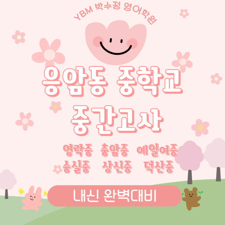 안녕하세요 응암동 영락중, 충암중, 예일여중 숭실중, 상신중, 덕산중 YBM 박수정 영어학원입니다. 엊그제 새 학기 책가방을 챙겨 보낸 것 같은데 어느덧 거리에는 벚꽃이 흩날리기 시작했습니다. 꽃구경에 설레는 마음도 잠시 우리 중등부 학부모님들 마음 한구석에는 ‘중간고사’라는 묵직한 숙제가 자리 잡고 계실 줄 압니다. 은평구를 넘어 '금평구'라 불릴 만큼 교육 열기가 뜨거운 응암동 그 중심에서 우리 아이들이 다니는 영락중, 충암중, 예일여중, 숭실중, 상신중,덕산중의 중간고사 일정을 정리해 드립니다. 영락중학교: 4/29(수)~4/30(목) 충암중학교: 4/29(수)~4/30(목) 예일여중 : 4/29(수)~4/30(목) 숭실중학교: 4/22(....... <img src="https://blogthumb.pstatic.net/MjAyNjA0MjBfMjg2/MDAxNzc2NjkwMTUxMDI5.ZrEHUuRbqp1pQbKfCQJapT9e2iDi4-HZZX-Mg2J0Gb8g.dmHZR9lQ9ACvM6LD1WTrlNSSKcCibm2Jt-oUxYnVsiwg.PNG/1.png?type=s3" />