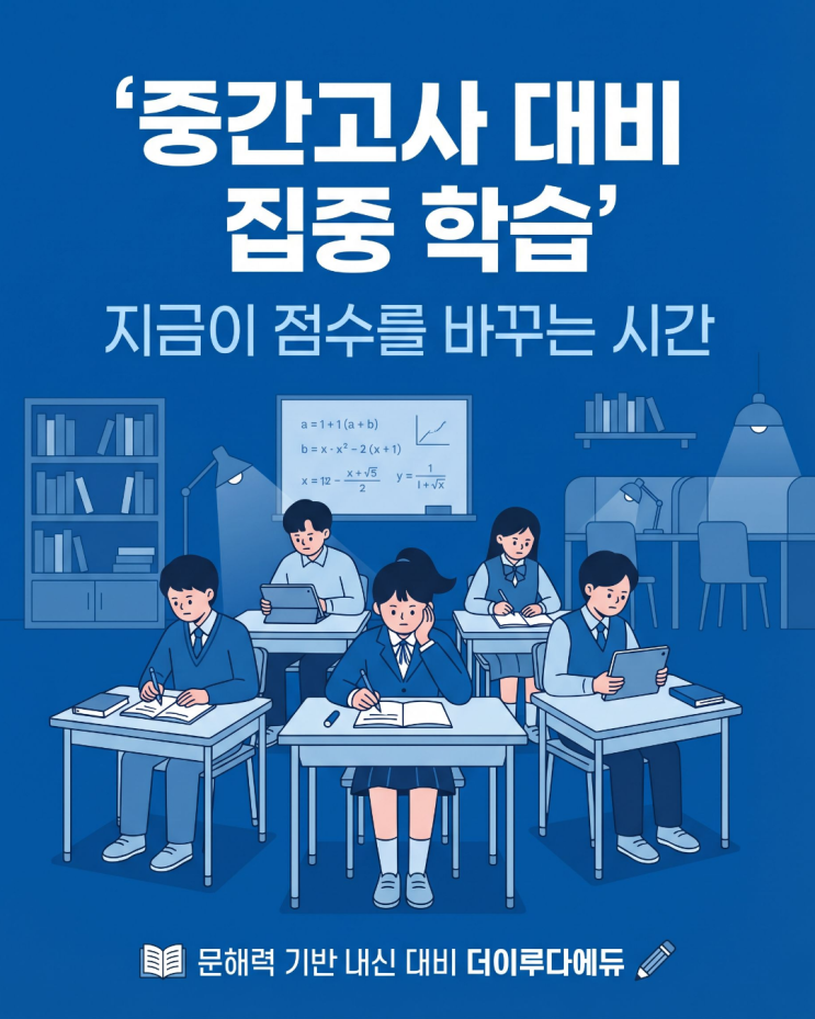 안녕하세요? 더이루다에듀 독서토론논술 학원 입니다 더이루다에듀는 꿈을 꾸고 만들고 이루어지게 함께 합니다. 책 읽고 토론하고 생각을 글로 완성하는 곳 중간고사가 다가오고 있습니다. 학원 안 분위기도 완전히 ‘시험 모드’로 바뀌었습니다. 사진 속 모습처럼 아이들이 각자 자리에서 집중해서 문제를 풀고, 답안을 정리하는 모습이 이어지고 있습니다. ✍️ 지금은 ‘완성도’를 끌어올리는 시간 시험 준비는 단순히 많이 공부하는 것이 아니라 ✔ 얼마나 정확하게 알고 있는지 ✔ 얼마나 실수 없이 풀 수 있는지 이 두 가지가 중요합니다. 더이루다에듀 시험대비 포인트 중·고등부 시험 대비는 더 촘촘하....... <img src="https://blogthumb.pstatic.net/MjAyNjA0MjZfMjk4/MDAxNzc3MTMyMjUyNDY0.W-WVJGhe0Xr9tI8ayP73HEyEE-RRG13f8nd1denFHocg.U5KS5DwBC2BT24QuIYqoQydzsG6-GB_YgfYSLX4IZ5Yg.PNG/%C1%A6%B8%F1%C0%BB_%C0%D4%B7%C2%C7%D8%C1%D6%BC%BC%BF%E4._%2875%29.png?type=s3" />