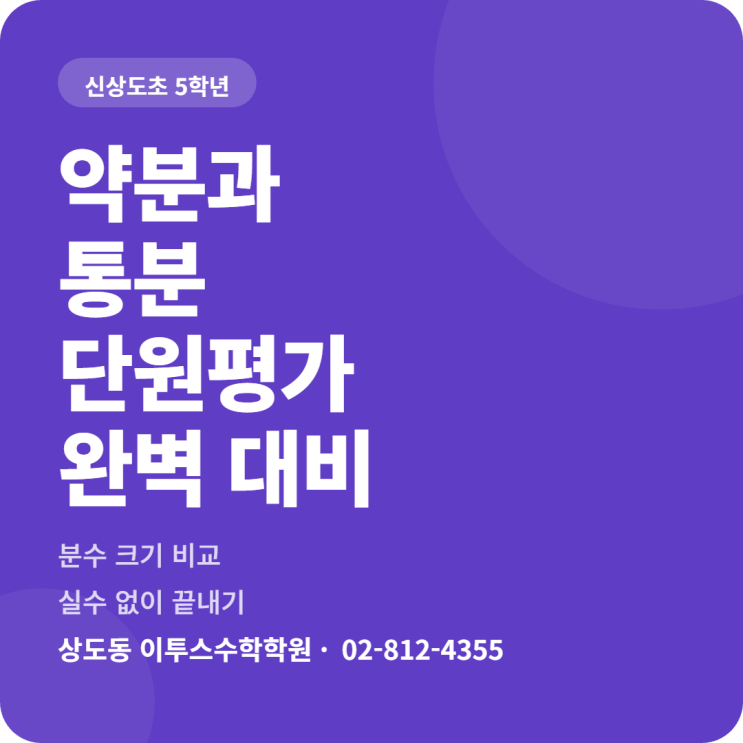 안녕하세요. 상도동수학학원 이투스수학학원입니다. 신상도초 5학년 수학에서 약분과 통분 단원은 분수 계산 전체의 기초가 됩니다. 이 단원이 흔들리면 분수의 덧셈, 뺄셈, 곱셈까지 연쇄적으로 어려워집니다. 오늘은 핵심 개념부터 자주 틀리는 유형, 단계별 연습 문제까지 꼼꼼하게 안내드립니다. ■ 핵심 개념 완전 정리 1. 약수와 공약수 약분을 하려면 약수 개념이 먼저 완성되어 있어야 합니다. 약수는 어떤 수를 나누어 나머지가 0이 되게 하는 수입니다. 12의 약수: 1, 2, 3, 4, 6, 12 18의 약수: 1, 2, 3, 6, 9, 18 12와 18의 공약수: 1, 2, 3, 6 최대공약수: 6 이 개념이 흔들리면 약분 과정에서 계속 막힙니다. 2. 약분이란 분수의 분....... <img src="https://blogthumb.pstatic.net/MjAyNjA0MjBfNjAg/MDAxNzc2NjY3MjQ5NzE1.BPTE5HbykLPcKottJKp9sJ4pF9F4ZCKEGAtCSyiKx6sg.M5CKqq9s4qfzJ-JIM8npNxiLNV2skeW6dAiJmrhSWBYg.PNG/5학년_약분통분_01_표지.png?type=s3" />