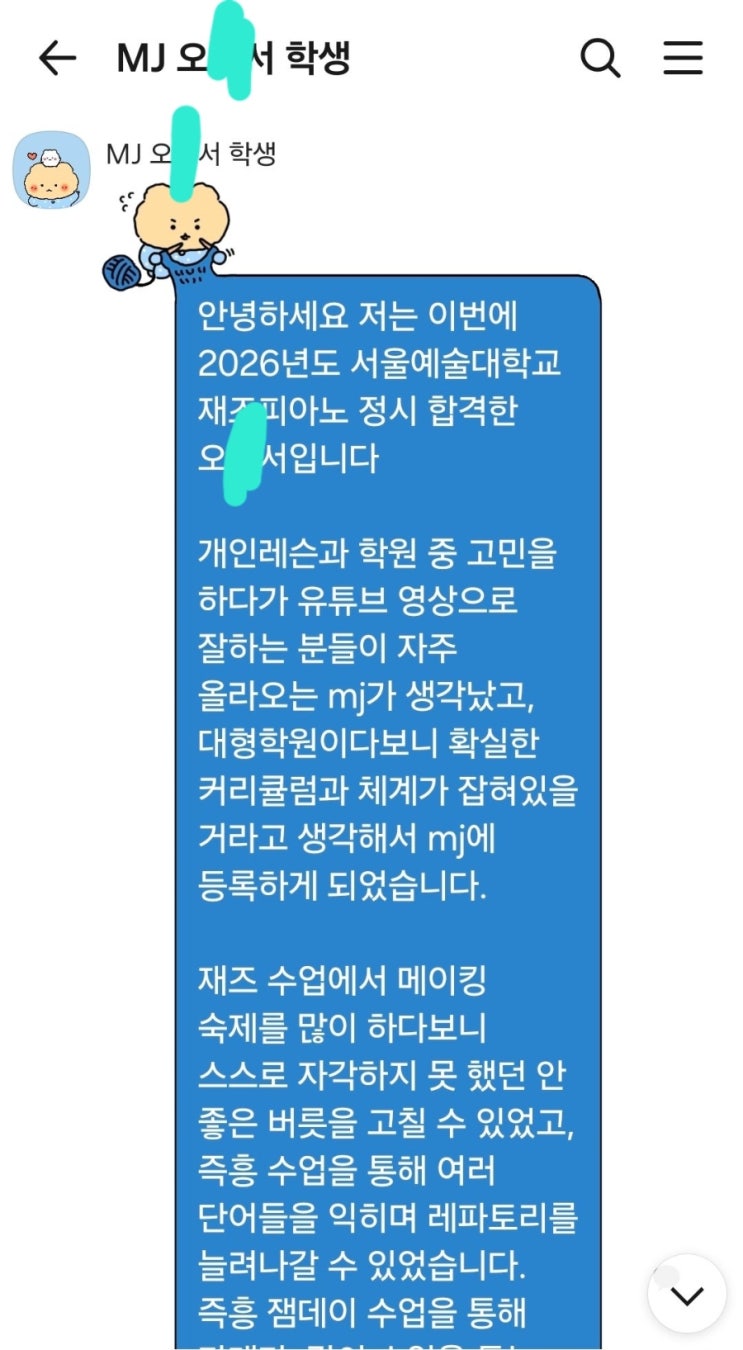 서울예대 합격한 오*서 학생이 직접 작성해서 보내준 후기 ------------------------------------------------------ 안녕하세요 저는 이번에 2026년도 서울예술대학교 재즈피아노 정시 합격한 오*서입니다. 개인레슨과 학원 중 고민을 하다가 유튜브 영상으로 잘하는 분들이 자주 올라오는 mj가 생각났고, 대형학원이다보니 확실한 커리큘럼과 체계가 잡혀있을 거라고 생각해서 mj에 등록하게 되었습니다.재즈 수업에서 메이킹 숙제를 많이 하다보니 스스로 자각하지 못 했던 안 좋은 버릇을 고칠 수 있었고, 즉흥 수업을 통해 여러 단어들을 익히며 레파토리를 늘려나갈 수 있었습니다. 즉흥 잼데이 수업을 통해 카메라, 같이 수업을 듣는 분들....... <img src="https://blogthumb.pstatic.net/MjAyNjA0MDdfODAg/MDAxNzc1NTM0MTE2ODMy.yKPax9aS94hkvrhADGZ5IvKSxjZPj1ZvElkdcJ4SbIwg.y4zowAEJffDWO0_cgMDKS66naqtZuypzXS0Tkpu_Obog.JPEG/900%A3%DF14137.jpg?type=s3" />
