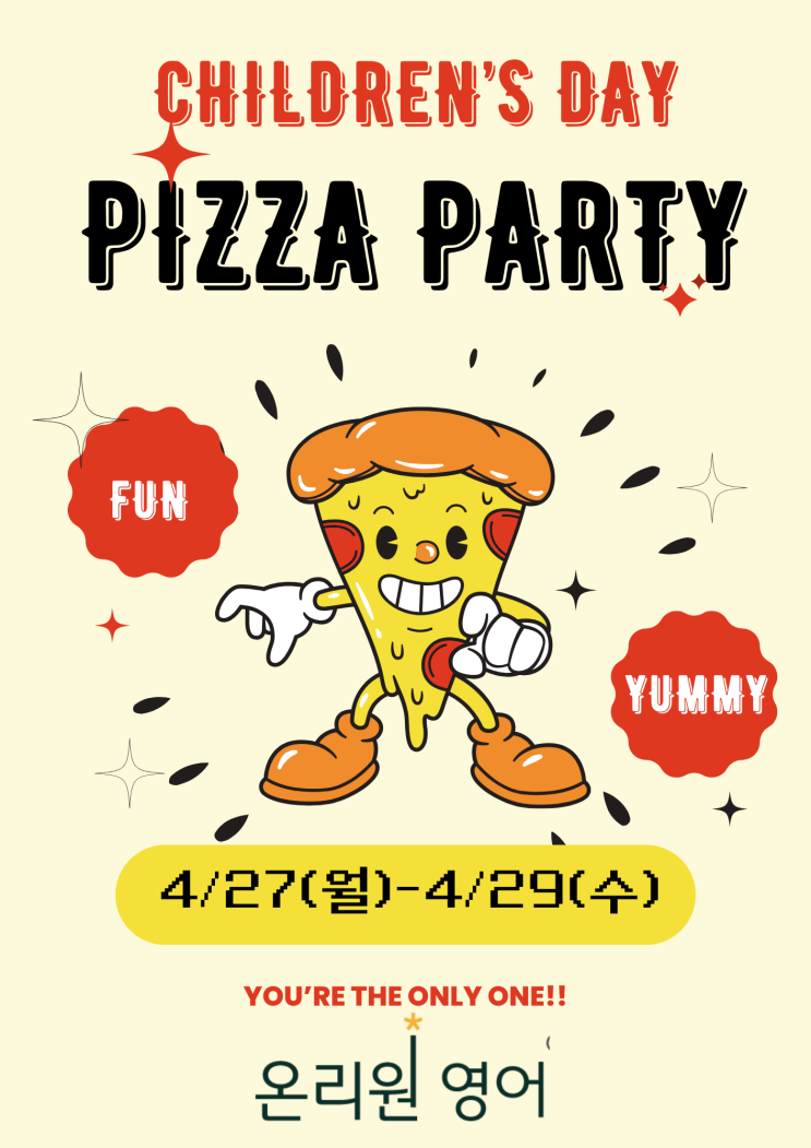 며칠 전 수업이 끝나고 2학년 쪼꼬미 한 명이 저한테 달려왔습니다. "원장님~ 어린이날은 왜 이리 안 오는 걸까요?" 저도 모르게 웃음이 터졌습니다. "이제 한 달밖에 안 남았어~ 어린이날이 너무 기다려지는구나?" 그랬더니 눈을 반짝이면서 이렇게 답하는 겁니다. "네!! 온리원에서 피자파티 하니까요!! " 이 대화를 집에 가면서도 계속 생각했습니다. 한 달이나 남은 어린이날을 매일 기다리고 있는 아이. 그 기다림의 이유가 피자파티라는 것. 그게 얼마나 귀엽고, 또 얼마나 감사한 일인지요^^ 온리원영어가 문을 연 날부터 한 번도 빠지지 않고 지켜온 것이 있습니다. 매년 어린이날, 아이들과 함께하는....... <img src="https://blogthumb.pstatic.net/MjAyNjA0MTVfNiAg/MDAxNzc2MjQ4ODA4Mzg3.wbhAi1Lp3pYfH7mMY93otJYUVW0uTrfsfkLHUmOdLM4g.eHIdF9u-QZloVo7fKgpCKnAn1pz6d5E1OH0VKQFOAGkg.PNG/%C7%C7%C0%DA%C6%C4%C6%BC_%BE%C8%B3%BB%282026%29.png?type=s3" />
