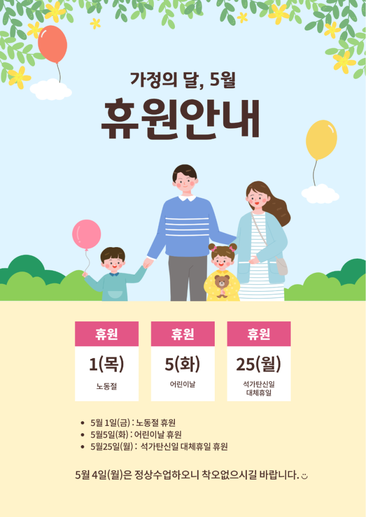 안녕하세요, 이화더뮤직 음악학원입니다. 가정의 달 5월을 맞아 학원 운영 일정 안내드립니다. 다음과 같이 휴원일을 안내하오니 수업 일정에 착오 없으시길 바랍니다. 항상 보내주시는 관심과 성원에 감사드리며, 가정의 달을 맞아 가족과 함께 따뜻하고 행복한 시간 보내시길 바랍니다. 더 좋은 수업으로 찾아뵙겠습니다. 감사합니다 <img src="https://blogthumb.pstatic.net/MjAyNjA0MjhfOTEg/MDAxNzc3MzU2OTYyMTQ5.MXLOraccr6xsH-Yn4uhIu_31KgnZ7OqW2h4Cf_UKjaYg._3pzWBTCO93IPs4hiRVl4-ccPnhnxYZ2keWy-Qf6_8Yg.PNG/900_%C6%C4%BD%BA%C5%DA_%C0%DA%BF%AC%B0%FA_%B0%A1%C1%B7_%C0%CF%B7%AF%BD%BA%C6%AE_5%BF%F9_%B0%A1%C1%A4%C0%C7_%B4%DE_%C8%DE%C1%F8_%BE%C8%B3%BB_%C0%FC%B4%DC%C1%F6.png?type=s3" />