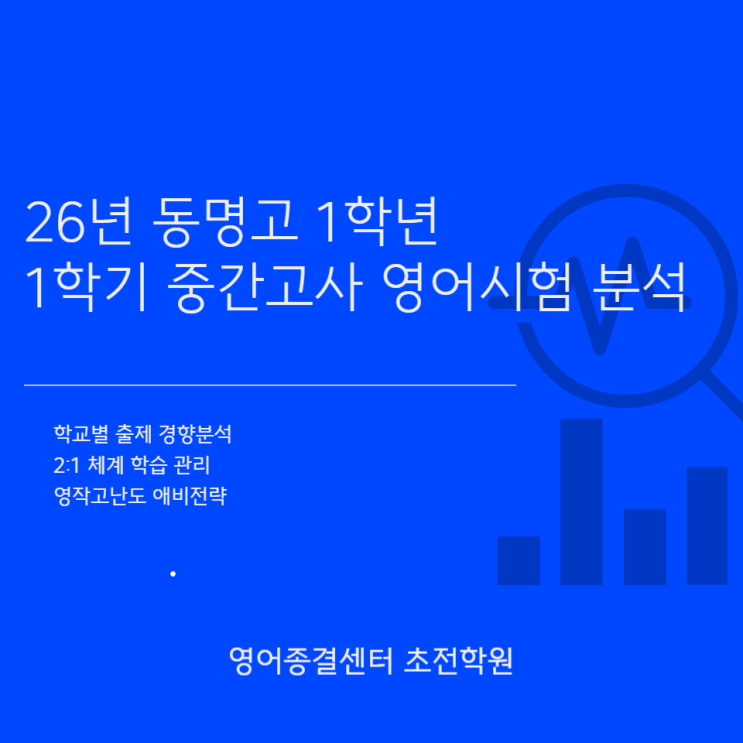 초전동영어학원, 학생, 학부모님 안녕하세요. 영어종결센터 초전학원입니다. 오늘은 동명고1학년 중간고사 분석입니다. 이번 동명고1학년 1학기 중간고사는 그 어떤때보다 방대한 시험범위가 특징이었습니다. 그래서, 변형은 없지만 학생들이 짧은 기간에 그 모든 범위를 다 보는건 불가능하다고 보고, 내신보다는 모의고사 평가기준을 적용해 보았습니다. 초전동에서 가장 빠른 분석! 영어종결센터 초전학원의 동명고1학년 1학기 중간고사 분석. 시작합니다. 1. 문제출제비중 "부교재와 모의고사가 승부처" 이번 동명고 시험은 단순 교과서 위주가 아닌, 부교재(외부 지문)의 비중이 지독하게 높았습니다. 부교재(63%): 전체 문항의 절....... <img src="https://blogthumb.pstatic.net/MjAyNjA0MjZfMjQ1/MDAxNzc3MTg5MDk2OTYz.yzOsdpgwaMNWrbTLVRwaVc_184xprOaumItFFZW5tBEg.Bu-fGDZoj0o1m1Tdzna-ykZTdWhjQXWArw427M15tl4g.PNG/%C1%A6%B8%F1%C0%BB_%C0%D4%B7%C2%C7%D8%C1%D6%BC%BC%BF%E4_-001_%282%29.png?type=s3" />