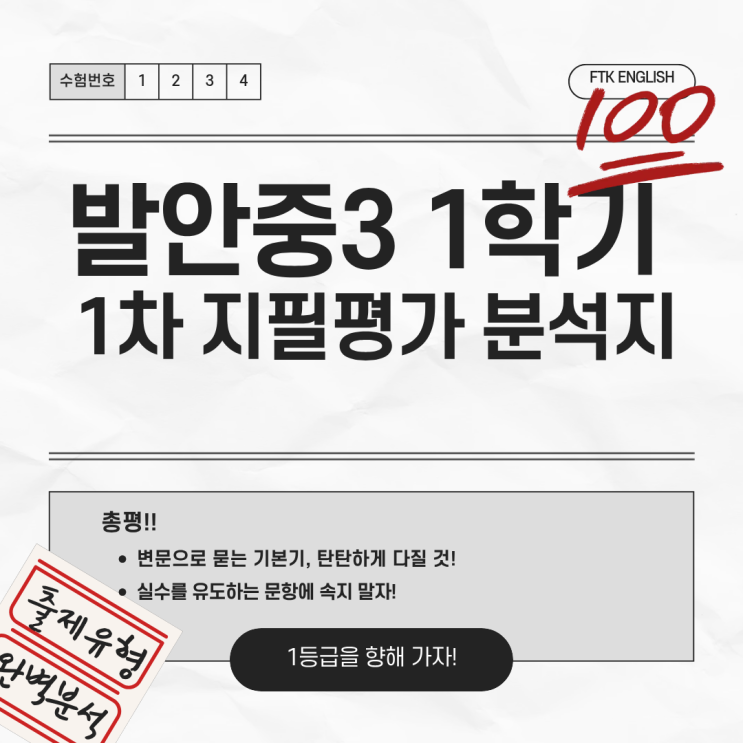 안녕하세요! 향남 대표 영어학원 앞서나가는 FTK English 캠퍼스 입니다! 중학교 3학년의 마중물이라 할 수 있는 발안중학교 3학년 1학기 1차 지필평가가 마무리되었습니다. 첫 발걸음을 내딛는 만큼 중요한 시험이었을텐데 중학교 3학년의 첫 시험에 최선을 다해 임해준 우리 학생들에게 많은 격려의 박수를 부탁드립니다!! 이번 발안중3 시험은 충분히 깊게 생각하고 풀어야 함정에 빠지지 않았을 문제들로 구성된 '사고력'이 상위권의 핵심 변별력으로 작용한 시험이었습니다. 특히 어법과 서술형이이 변별력을 높였던 이번 시험을 차근차근 분석해 보겠습니다! “함정은 디테일에 있다” 이번 발안중 3학년 영어 시험은 겉으로 보....... <img src="https://blogthumb.pstatic.net/MjAyNjA0MjlfMjMx/MDAxNzc3NDcwNzQzNzQ3.ZNrFZRLykwdeRqJWr8FU8PSdW6QtT5n6qoN-YYaLm80g.y38pJWnuekn2MX6GX8zBmWMIEo3qCMFs1T90zSzbl7Qg.PNG/1.png?type=s3" />