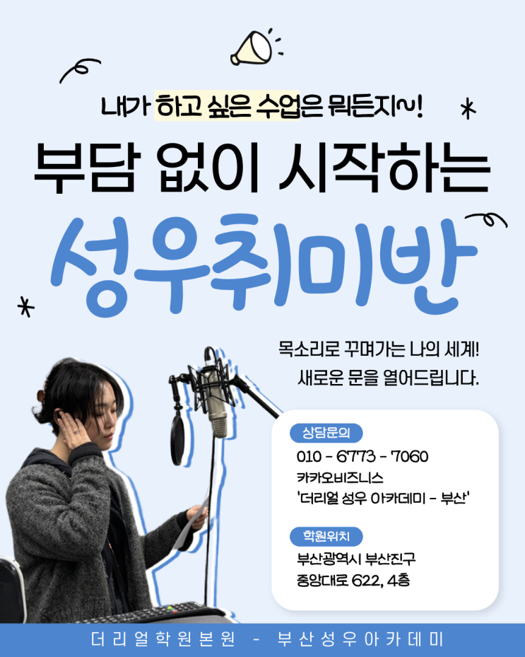 목소리에 고민 있어? 부담 없이 성우 공부를 시작해봐! 고민을 완벽 해결해줄 마스터 키️ 성우취미반 모집 중! [더리얼학원본원-부산성우아카데미]