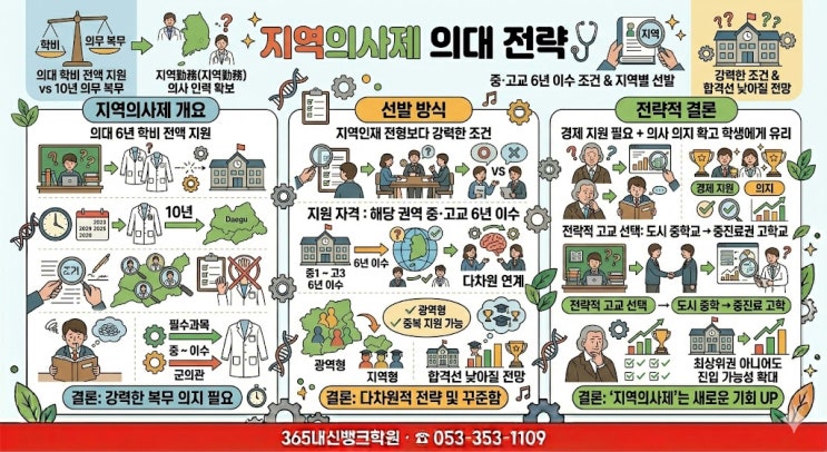 #지역의사제 #의대입시 #2027대입 #입시지형변화 #365내신뱅크학원 #대구입시분석 #의대진학전략 안녕하세요! 대구 북구 입시의 중심, 365내신뱅크학원입니다. 최근 "내신 3등급도 의대에 갈 수 있다"는 파격적인 분석이 나오며 학부모님들의 이목을 집중시킨 '지역의사제'에 대해 알고 계시나요? 지역 의료 공백 해소를 위해 도입된 이 제도가 의대 문턱을 어떻게 변화시킬지, 입시 전문가들의 분석을 토대로 그 실체를 정리해 드립니다. 1. 지역의사제란 무엇인가: 혜택과 의무 지역의사제는 경제적 지원과 장기 의무 복무가 결합된 일종의 '의사 사관학교' 모델입니다. 파격적인 경제 지원: 의대 6년 동안....... <img src="https://blogthumb.pstatic.net/MjAyNjA0MjhfNDYg/MDAxNzc3MzUyNjU5MDIy.Z_fHvVeE6-QrxjOVfB68yNu_2NKYtkw812emhFMjZZwg.zB3EcnoozIUVOJZL9rcg5uIQsIOGF--s8pRhESbmrSog.JPEG/%C1%F6%BF%AA%C0%C7%BB%E7%C1%A6.jpg?type=s3" />