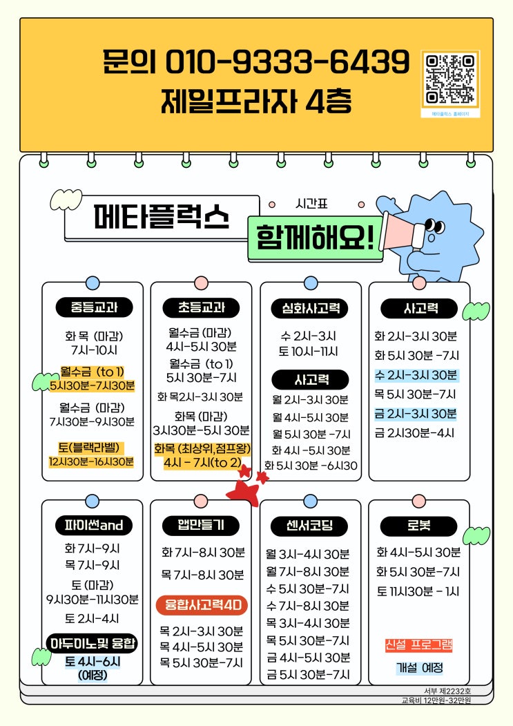 2026년을 준비하며 메타플럭스의 2026년도 정규 시간표와 신입생 모집 안내를 드립니다. 메타플럭스는 ✔ 사고력 수학및 교과 수학 ✔ 융합사고력(수학 과학 사회 역사 메카트로닉스) -> 5월 신설 ✔ SW·코딩 ✔ 로봇·센서코딩 ✔ 영재·대회 대비 까지 한 아이의 사고 흐름을 길게 보는 수업을 운영하고 있습니다. 단순히 ‘잘 푸는 아이’보다 생각하고 설명할 수 있는 아이, 도전 앞에서 멈추지 않는 아이를 키우는 것이 목표입니다. 수업 과목 및 시간표 안내 ■ 중등 교과 화·목 7시–10시(마감) 월·수·금 7시30분–9시30분(마감) 월·수·금 5시30분–7시30분(to 1) 토(블랙라벨) 12시30분–4시30분 ■ 초등 교과 월·수·금....... <img src="https://blogthumb.pstatic.net/MjAyNjA0MjBfNzkg/MDAxNzc2Njg4MDY3NDk1.jiHaLQDH3SHNtJihyeXzUAbEHzsWuSsj02O39xdIjQIg.gOon9_OYBkRs76_PbDmww3UPu8sjCX0x5wLY5H559x0g.JPEG/%B0%FA%B8%F1%BA%B0-%BD%C3%B0%A3-260420.jpg?type=s3" />