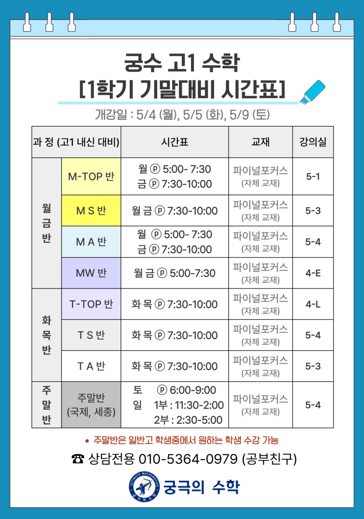 ◆ 1등급으로 가는 최상위 시스템 ◆ # 세종지역 내신 전문가 # 매 시험 100점을 배출하는 검증된 시스템 # 압(壓)도적인 강의 X 강(强)한 컨텐츠 X 독(毒)한 학습관리 ※ 시간표가 변동될 수 있습니다. 등록시 확인하시고 등록하시기 바랍니다^^ 【 고등부 수학 】 기말대비 시간표 ▶ 상담 문의 안내 ️ 학원상담전용 원장 010-5364-0979(공부친구) 목이 쉬도록 가르치고, 머리속까지 확인하겠습니다 #임채성수학 #임채성 #궁극의수학 #고등수학 #중등수학 #세종수학 #세종수학학원 #세종고등수학 #고등수학 #중등수학 #아름동수학학원 #의치약관 #의대사관학교 #수학전교1등 #아름고수학 #종촌고수학 #고운고수....... <img src="https://blogthumb.pstatic.net/MjAyNjA0MjBfMTMx/MDAxNzc2NjgzMTU2MDQw.VJccoKsXb4_FEjDsfHL9SZ9eGdGYgprT1C3vWXqq22Mg.tqt5kyrZ5zAnyWPKiJc7lYAnr4wQLOj5tIAH_07VDkAg.PNG/1.png?type=s3" />