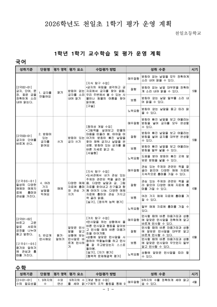 안녕하세요! '생각하며 읽는 힘'을 길러주는 솔루니입니다~ 천일초등학교의 1학기 평가 계획이 발표되었습니다. 국어과를 중심으로 학년별로 어떤 성취 기준을 목표로 평가가 진행되는지 미리 확인하여, 아이들이 자신감을 가지고 학습에 집중할 수 있도록 내용을 정리해 보았습니다. 1학년: 기초 문해력과 바른 소통의 시작 1학년은 한글의 기초를 다지고 학교생활에 필요한 바른 태도를 갖추는 데 집중합니다. 읽기 및 쓰기 (5월): 받침이 없는 낱말을 정확하게 소리 내어 읽고, 받침이 빠진 낱말에 알맞은 받침을 넣어 글자를 완성하는 능력을 평가합니다. 매체 활용 (6월): 관심 있는 주제의 책을 스스로 골라 읽으며 다양한 매체....... <img src="https://blogthumb.pstatic.net/MjAyNjA0MjFfMzAw/MDAxNzc2NzU2NTM4ODk0.IFCYzOGiZWoQ_L4y_9ibPR7aKBsqKjfK5mo0SOFcpIwg.Q-kM8hfU6ckA99kDdC3WjirLg1gkSkq0I7TqornqyGwg.PNG/1%C7%D0%B3%E2.png?type=s3" />