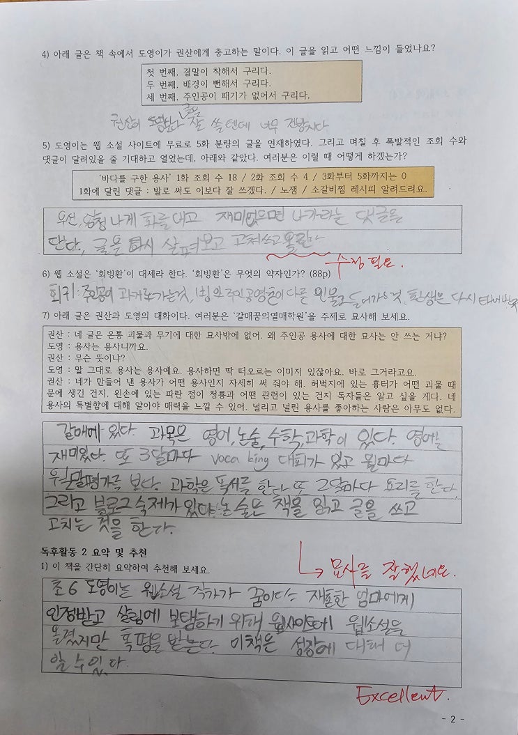 『펜 들고 레벨 업』 독후활동 이현지 글 / 김규택 그림 책 소개(예스24) 제7회 미래엔 어린이책 공모전 대상 수상작 가족과 성장의 의미가 찬란하게 빛나는 이야기! 잔잔한 물결처럼 다가와, 큰 파도 같은 묵직한 울림을 주는 작품 자신의 소설 속 주인공을 성장시키려 펜을 든 6학년, 도영이가 새로운 챕터로 써 내려가는 서툴고 아름다운 자기 성장의 기록! 초등학교 6학년 도영이는 웹 소설 작가가 되는 것이 꿈입니다. 아빠와 이혼한 뒤, 재혼한 친엄마에게 아들로서 인정받고 싶고, 함께 사는 할머니에게는 보탬이 되고 싶기 때문입니다. 그러기 위한 수단은 바로, 출판사와 계약해 웹 소설 작가가 되는 것이었습니다. 그러나 기대를 안고....... <img src="https://blogthumb.pstatic.net/MjAyNjA0MjhfMzEg/MDAxNzc3MzcwMjkyNDEy.RXbTOMYUR7bJK9dhCOovpWMGIAJsiuCMuDI-TUgt5eIg.Tx6sTrtxq_sIihWBqJNNdsnN_REfCIHywZpfTZaEXFcg.JPEG/KakaoTalk_20260428_185243682.jpg?type=s3" />