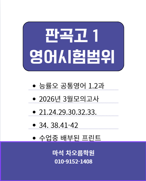 영어 시험 범위가 이제 확인 되었습니다. 시험이 코 앞인데 이제야 온전한 시험범위가 나왔네요. ㅠ.ㅠ 시험범위라도 빨리 알려주면 미리미리 준비할 텐데 우리 아이들 학습 부담이 이만 저만하지 않네요. 판곡고1 영어 시험범위 모고 지문고 해석자료는 무료 다운받기 가능합니다. 더 많은 자료는 차오름학원에서~~~ <img src="https://blogthumb.pstatic.net/MjAyNjA0MTJfMjkz/MDAxNzc1OTc2OTI3ODU3.vhYxtL2-RDCkS468xKioCbqhS938cd874MDd1L_uJfsg.Ys81kcdRL5qJWQPOrO1Bcie6JCxrKBTpbKPhUM_NxYQg.PNG/SmartSelectImage_2026-04-12-15-53-42.png?type=s3" />