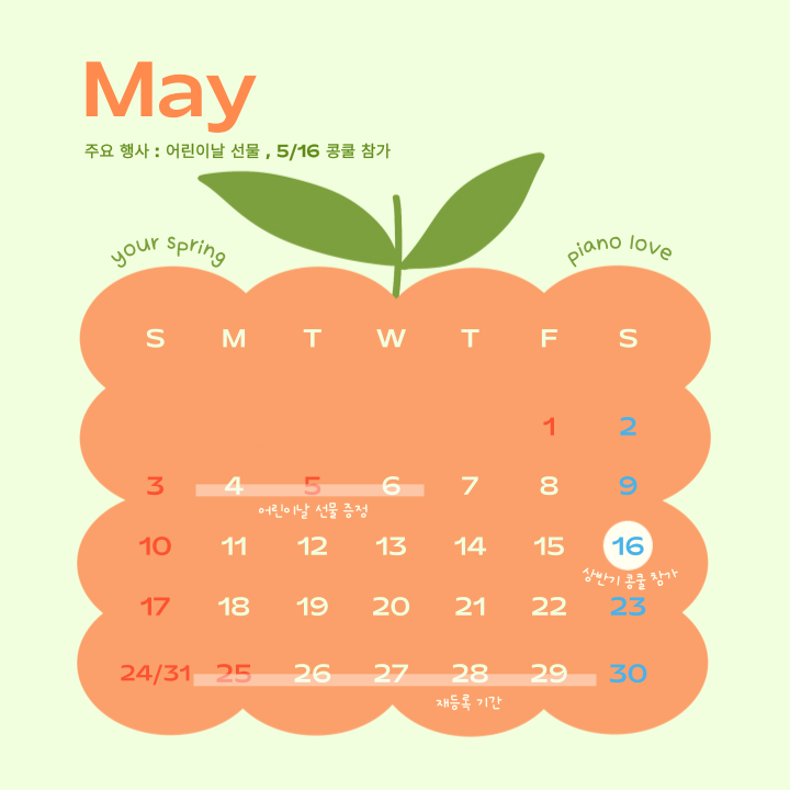자유롭게 표현하는 나의 따뜻한 음악 너의, 봄 음악학원 your spring piano 5월 재원생 안내문 너의, 봄 음악학원은 법정 공휴일은 쉬어갑니다. 연속되는 공휴일로 인해 수업 일수가 부족한 학생들은 개인별 보강 신청 안내 연락을 드립니다. 이에 보강 해당 학생은 2,3,4,5월 수업 일수를 합산하여 부족한 학생들을 대상으로 안내를 드립니다. 세미초등학교 3,4학년 학생 중 수업 변경 및 보강에 해당하는 학생은 미리 연락 부탁드립니다 :) 5월 캘린더 5월은 공휴일로 인하여 어린이날 이지만 정상 수업으로 운영됩니다. 아이들을 위한 너의, 봄 음악학원의 선물 증정과 할 건 하고, 즐거울 땐 즐겁게 보내는 하루를 보낼께요 ! 5월 16일....... <img src="https://blogthumb.pstatic.net/MjAyNjA0MjJfMjU1/MDAxNzc2ODMwODYzODUy.wVLMyYwpYeDdgXZx0KeAh25a6FLnHVx-o3PKRuaw1v0g.80Mp4C44OtzTf4aQ0VgdNxPLLbNAH10Q1Sw1I4FZldAg.PNG/003.png?type=s3" />