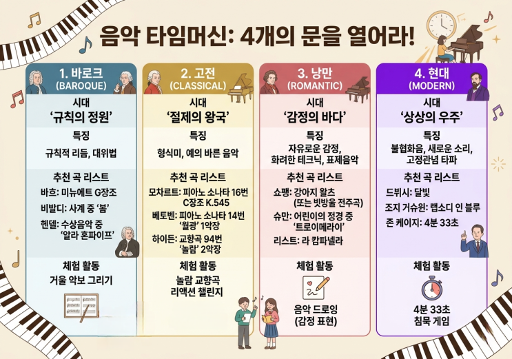 안녕하세요, 피아노스토리 입니다^^ 오늘은 우리 아이들과 함께 아주 특별한 여행을 다녀온 소식을 전해드려요. '클래식은 왜 어려울까?' 라는 질문에서 시작된 이번 특강! 딱딱한 이론 대신, 타임머신을 타고 각 시대로 돌아가 그 시대의 공기를 느껴보는 시간을 가졌습니다. 보시는 바와 같이 4개의 시대로 나누어서 각 시대의 특징과 감상 타임을 가졌는데요! 바로크, 고전, 낭만, 현대로 각 주제마다 색다른 노래들을 들으며 시대의 구분을 확실히 하게 되는 특강이였습니다! 이렇게 각 세션마다 준비된 학습지를 통해 특징을 공부하였습니다. Door 1. 바로크 (Baroque): 규칙의 정원 핵심: 규칙적인 리듬과 대위법을 '거울 악....... <img src="https://blogthumb.pstatic.net/MjAyNjA0MjFfMTE5/MDAxNzc2NzQ1OTIzNzg1.rI_u3_g4cUNR8Ed8XVbjMC0_7yViAgQR5cXOFAwW_dMg.wgcmwaaAauZF21eSFG04GyfVcVS_4zSyNrYuwlGAAbYg.PNG/image.png?type=s3" />