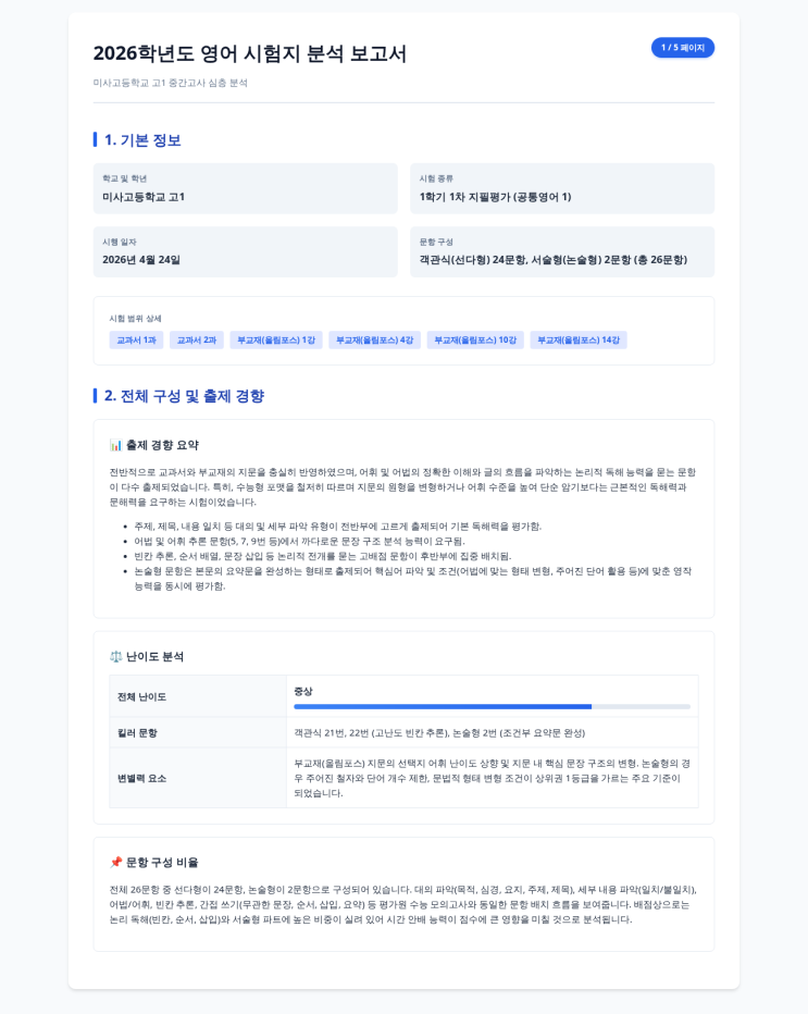 안녕하세요. 미사고1 담당 양서연T입니다. 26년 4월 24일(목요일) 오늘 본 시험 분석 시작합니다. 중등 영어와는 차원이 다른 고등 영어의 매운맛을 본 우리 학생들을 위해, 이번 시험의 핵심 특징과 앞으로의 학습 방향을 완벽하게 정리해 드립니다. 1. 전체 총평 및 출제 경향 이번 미사고 시험은 전체적으로 '중상' 정도의 난이도를 보였습니다. 단순히 지문을 암기하는 것을 넘어, 수능형 사고력과 응용 능력을 요구하는 문항들이 대거 배치되었습니다. 수능형 포맷의 완성: 객관식 문항 대부분이 수능 모의고사 유형을 충실히 따랐습니다. 지문 변형 및 어휘 심화: 지문의 원형을 그대로 두지 않고 어휘를 바꾸거나 문장 구....... <img src="https://blogthumb.pstatic.net/MjAyNjA0MjRfMTky/MDAxNzc3MDA1ODI1MjU1.lFMANhSxlPthugzuV4UyRQaDPRYK4qOx7p6teHC8V18g.HnpN0q63GIiXcVel7VV-uqVb4F06G7gPnWCHhxYhxSMg.PNG/page_1.png?type=s3" />