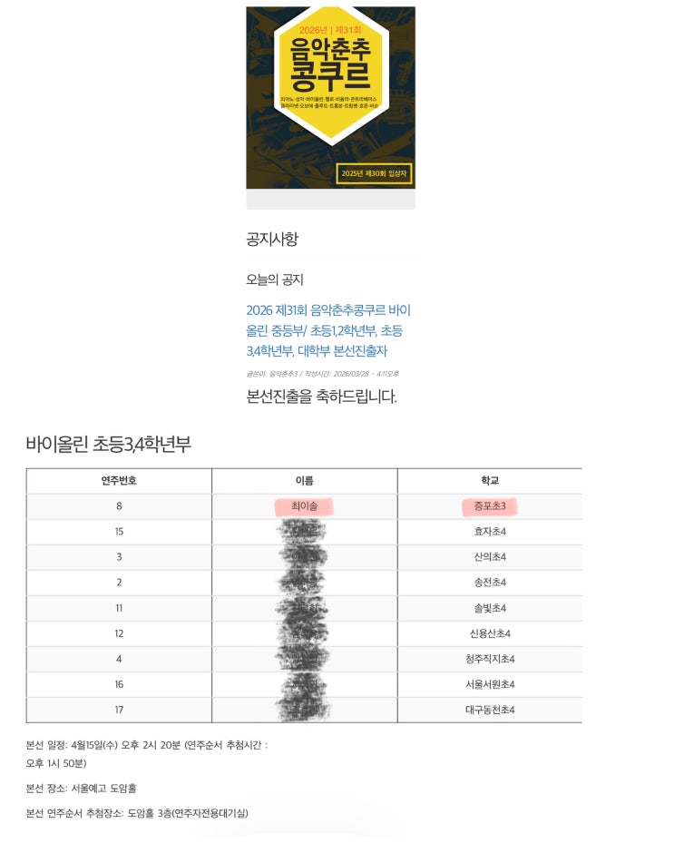 국내 최고 권위 ‘음악춘추 콩쿠르’ 예선 당당히 통과 쟁쟁한 3, 4학년부 선배들 사이에서 당당하게 실력을 입증하며, 유일한 3학년으로 본선에 진출했습니다! <img src="https://blogthumb.pstatic.net/MjAyNjA0MDdfMjYy/MDAxNzc1NTI2NzI0MzI0.Gs3lSUu7gIfXKGlxQ-rSvEyp3J5ZdqHkJ2qcfhoNmeEg.p9QigddudFDlf-5odjdC4qrvCC_TE7BEZV-OvBHpWAIg.JPEG/%C0%BD%BE%C7%C3%E1%C3%DF.jpg?type=s3" />