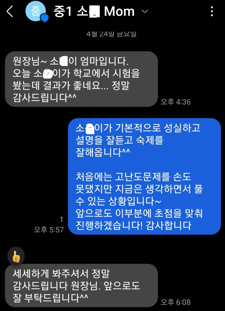[운양동 수학학원] [중1학생 어머님 문자] 대치스카이 수학학원 [수학전공 원장직강]