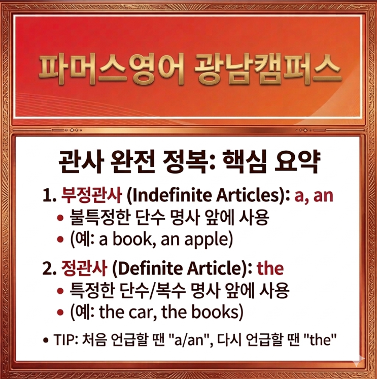 안녕하세요! 아이들의 웃음소리가 끊이지 않는 즐거움이 배움이 되는 곳, 태전동영어학원, 파머스 영어 광남 캠퍼스의 에릭쌤 원장입니다. 드디어 우리 Silver Stella A1반 친구들이 이번 교재부터 대망의 '문법’에 발을 들였습니다! 사실 영어 문법 하면 머리부터 지끈거려 하는 아이들이 많잖아요? 특히 a, an, the 같은 관사는 어른들에게도 헷갈리는 영역이죠. 하지만 우리 아이들이 누굽니까! 공부도 놀이처럼 즐기는 '파머스 키즈' 아니겠어요? 딱딱한 설명 대신 가장 신나는 TGIG(Thank God It's Game day) 시간을 통해 관사를 완벽 정복해 보았습니다. 준비물부터 진심인 원장님의 '특급 교구' 아이들의....... <img src="https://blogthumb.pstatic.net/MjAyNjA0MjZfNzgg/MDAxNzc3MjAyNTA3NTA3.n8XBtcXWdpys4mlzOklRyUvOO3n8HWoCwGM7RYfxd18g.bQt3WrMogqMocTnZaS3eMxD5tX70sh_LUYGMlznNcGog.PNG/Gemini_Generated_Image_hp0rgahp0rgahp0r.png?type=s3" />