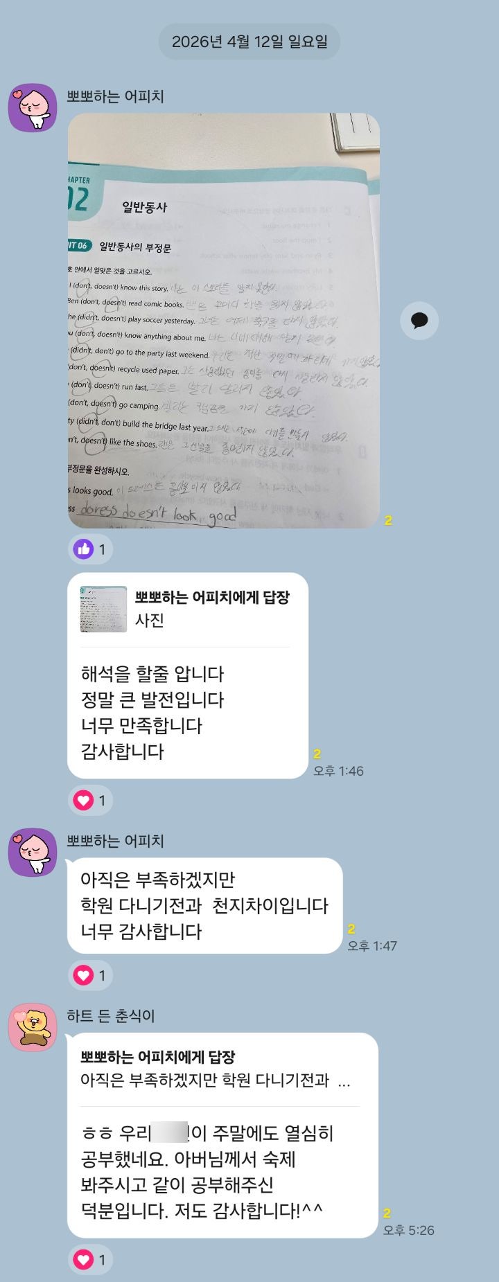해석을 할줄 압니다. 정말 큰 발전입니다! 학원다니기 전과 천지차이입니다! 맨투맨 학부모님의 답변으로 본 기초밸런스의 중요성!