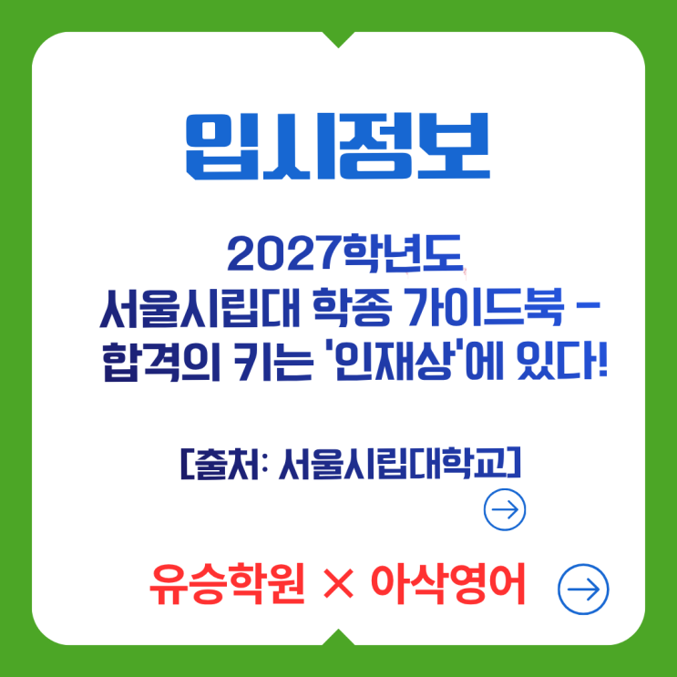 안녕하세요. 원주 단구동에서 20년, 실력으로 결과의 차이를 만드는 유승학원입니다. 인서울 상위권 대학을 목표로 하는 수험생들의 워너비, 서울시립대학교의 2027학년도 학생부종합전형 가이드북이 발표되었습니다. 시립대는 단순히 성적이 좋은 학생이 아니라, 각 학과가 원하는 역량을 갖춘 학생을 선발하는 데 매우 진심인 학교입니다. 1. 숫자가 증명하는 서울시립대의 경쟁력 89.4%의 유지 취업률: 단순히 취업만 잘 되는 것이 아니라, 취업의 질이 매우 높음을 의미합니다. 101.5%의 장학금 수혜율: 서울시의 지원으로 학생들이 등록금 걱정 없이 학업에만 전념할 수 있는 환경입니다. 학기당 약 107.8만 원(인문사회): 국공립대 중....... <img src="https://blogthumb.pstatic.net/MjAyNjA0MjVfMjE0/MDAxNzc3MTE5NTk1MjEz.3hQw2RV37ECLyUm2-Ef5sAvchzGiIt5p3F8HJtnwyeog.OgehK_2veaPRbO5sox4Fde4OjorgsIAY0E520l4_Db4g.PNG/%C6%C4%B6%F5%BB%F6%B0%FA_%B0%CB%C1%A4%BB%F6_%BD%C9%C7%C3%C7%D1_%BE%C6%C0%CC%C4%DC_%C0%FC%B9%AE%C0%FB%C0%CE_%B0%E6%C1%A6_%B1%DD%C0%B6_%BF%EB%BE%EE_%BB%E7%C0%FC_%C1%A4%BA%B8_%BE%C8%B3%BB_%C0%CE%BD%BA%C5%B8%B1%D7%B7%A5_%C4%AB%B5%E5%B4%BA%BD%BA_%288%29.png?type=s3" />