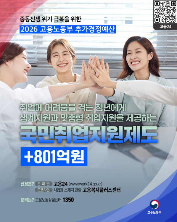중동전쟁 위기 극복 위한 2026 고용노동부 추가경정예산 취업에 어려움을 겪는 청년에게 생계지원과 맞춤형 취업지원을 제공합니다. 국민취업지원제도 신청은 고용24(work24.go.kr)에서 신청하시면 됩니다. #고용노동부 #노동부 #추가경정예산 #국민취업지원제도 #청년취업 <img src="https://blogthumb.pstatic.net/MjAyNjA0MTdfMjYx/MDAxNzc2Mzg3NDM1MDkw.UsO_GRwCzVjZMUEpTK6BdZlrgs_BK3ORhk_V4j9pdlYg.d-iJ-mH1bYYLYes2jwUeLNIXNTdxqTqrH9XSRBA1cbog.JPEG/01.jpg?type=s3" />