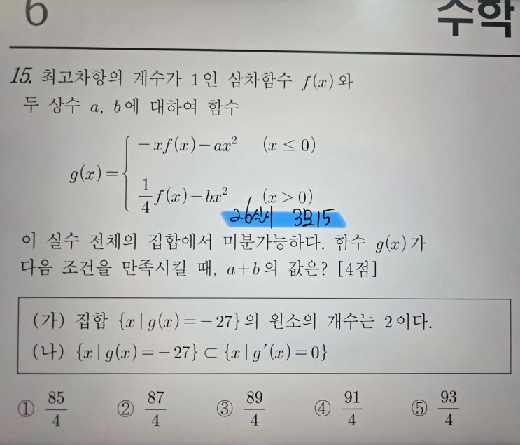 안녕하세요. 대치동 독학재수 & 수학학원 리미트제로입니다. [2026학년도 3월 모의고사 15번] 이번 3월 모의고사 문항 대다수가 리미트제로 수학학원에서 중점적으로 꼽은 포인트들과 판박이로 출제되었습니다. 오늘은 그 중 15번에 대해 소개하고자 합니다! [2026학년도 3월 모의고사 15번] 해당 문항을 통해 학생들의 “풀이 속도 차이”가 왜 발생하는지 어떻게 줄여야 할지를 설명하겠습니다. 이 문제는 단순히 어려운 문제가 아니라 접근 방식에 따라 풀이 시간이 크게 달라지는 유형입니다. 1. 문제 자체는 “복잡한 구조형 문제” 먼저 EBS 정석풀이를 확인해보겠습니다. 개요 잡아내는데 필요한 가정이 벌써 3개 이상 들어가 있습니....... <img src="https://blogthumb.pstatic.net/MjAyNjA0MjBfMjk5/MDAxNzc2Njg4Njg2NzA4.h4rDSc84VyQK050wstl3axpH3caWZxL0FaiNdBZqnEcg.FlTRnIZ91TnuLm4ZOp2GNx7djYag8GSYRYENtW8Q5UMg.JPEG/1._26%BD%C7%BD%C3_%B0%ED3_3%BF%F9%B8%F0%C0%C7%B0%ED%BB%E7_15%B9%F8_-_%B9%AE%C1%A6.jpg?type=s3" />