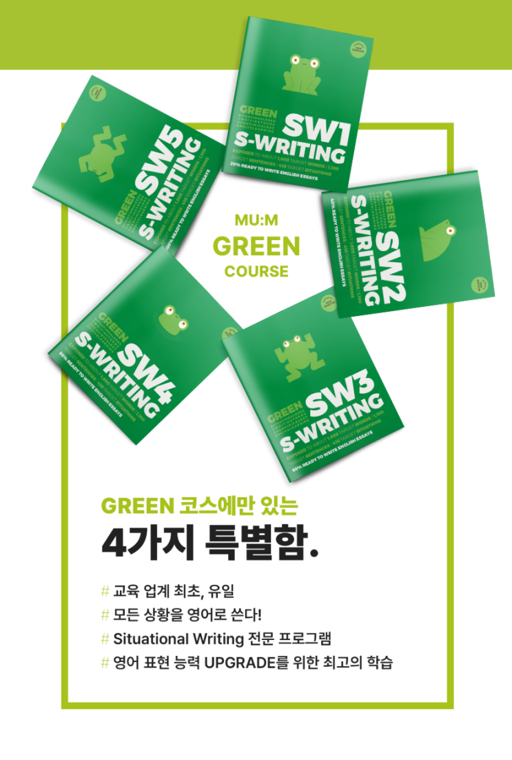 영어는 ‘언어’입니다. input을 쌓는 것만큼이나쌓인 input을 적절한 output으로 발현시키는 것이 중요합니다. 그래서 영어 학습 중기부터는 지금까지 쌓아온 것을, 스스로 꿰어내는 output 경험 이 반드시 필요합니다. 그래서 영어 학습 중기,뮤엠영어는 우리 아이의 학습 방향을‘영어 글쓰기 · 영어 논술’로 설정합니다. 뮤엠영어 Green SW 과정 Green SW 과정은 논리적 영어 글쓰기로 가기 전,마지막 ‘서술적 영어 글쓰기 단계’입니다. 영어 논술을 잘하기 위해서는 다양한 주제, 다양한 상황 을 많이 접해본 경험이 반드시 필요합니다. 그래서 뮤엠영어는 아이가 최대한 다양한 상황을 최대한 많이 경험할 수 있도록 오랜 연....... <img src="https://blogthumb.pstatic.net/MjAyNjA0MDhfMTk0/MDAxNzc1NjM2NjQ1NDMy.NMitZhhyb_xH1gcug-PSKh-_8w2kk5S8vyH04KhR0Hog.CmNC5xfjHJN4ePK4VSk-NBm_kcoM3XxVqGwy-_PrD0og.PNG/%BD%BA%C5%A9%B8%B0%BC%A6_2026-04-08_172326.png?type=s3" />