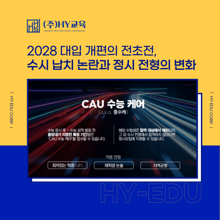 안녕하세요~ 대한민국 입시의 본질을 데이터로 증명하는 HY교육 입시분석팀입니다. 최근 중앙대가 발표한 CAU 수능 케어라는 제도가 입시판을 뜨겁게 달궜습니다. 수능 성적이 너무 잘 나와서 수시에 합격한 것이 오히려 손해(수시 납치)가 될 상황일 때, 학생이 합격 취소를 요청할 수 있게 하겠다는 파격적인 내용이었죠. 하지만 교육부가 "법 위반"이라며 강력히 제동을 걸면서 결국 철회되었습니다. 이 해프닝이 우리에게 남긴 시사점은 무엇일까요? 1. '수능 케어'의 좌절: 왜 안 된다는 걸까요? 중앙대의 의도는 명확했습니다. "수능 잘 나오면 더 좋은 대학 가도 좋아. 일단 우리 학교 수시에 마음 편히 지원해....... <img src="https://blogthumb.pstatic.net/MjAyNjA0MTlfMTkg/MDAxNzc2NTY0MDUwNDc3.nsBqc_9_rzZ8oF18zcBYPQDuN4y21aOMIJs-G5R1QMUg.KQYnFHGrP8qRgNTjBJLT8UEPOcUtRnAYUhSOKLLmgEsg.PNG/%BD%E6%B3%D7%C0%CF-001.png?type=s3" />