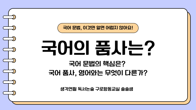 오늘은 퀴즈부터 시작해 볼까요? 국어의 품사는 몇 가지일까요? 8개? 이런 답을 하는 분들이 많으실 것 같은데요. 답은 9개, 9품사입니다. 그럼, 8품사는 어디에서 들었을까요? 네, 맞습니다. 바로 영어가 8품사입니다. 국어의 품사는 명사, 대명사, 수사 동사, 형용사 부사, 관형사 감탄사 조사 이렇게 9개입니다. 참고로 영어는 명사, 대명사 동사, 형용사, 부사 감탄사 접속사, 전치사 이렇게 8개입니다. 국어의 수사는 영어에서 모두 명사예요. 자, 국어와 영어에서 품사가 어느 부분에서 차이가 나는지 보이죠? 국어에서 관형사와 조사 영어에서 접속사와 전치사 바로 이 품사의 차이가 국어 문법과 영어 문법의 차이, 더 근본적으로 한국어....... <img src="https://blogthumb.pstatic.net/MjAyNjA0MjhfMjg2/MDAxNzc3Mzg2MDg0MDE3.n7dPhjMN4uynpqensh_78foIZ2ckcDQvcjNYytRXwZog.h3ljBExb6MLmKmHSUwvwmWrhRqQcEOMM0obxM-bpJU0g.PNG/%BA%B8%B6%F3%BB%F6_%C8%F2%BB%F6_%B1%F2%B2%FB%C7%D1_%B3%EB%C6%AE_%C0%CF%B7%AF%BD%BA%C6%AE_%BE%EE%B8%B0%C0%CC_%BF%C0%B4%C3%C0%C7_%BC%F6%BE%F7_%C7%D0%BD%C0_%C7%C1%B7%B9%C1%A8%C5%D7%C0%CC%BC%C7.png?type=s3" />