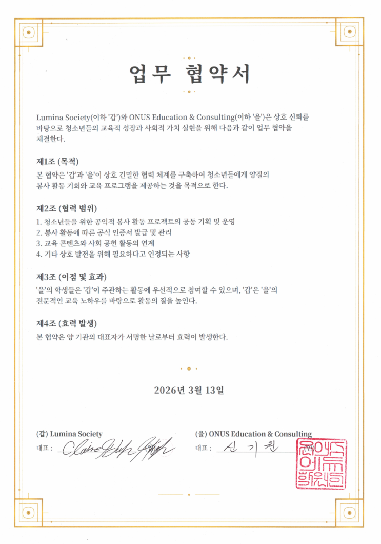 안녕하세요, ONUS Education & Consulting 입니다. 그동안 ONUS가 지향해온 교육의 가치는 학생들이 사회에 선한 영향력을 끼치는 진정한 리더로 성장하도록 돕는 것이었습니다. 이러한 비전을 구체화하고 공신력 있는 비교과 활동 기회를 제공하기 위해, 지난 2026년 3월 13일 비영리단체(NGO) 'Lumina Society'와 'ONUS Education & Consulting'이 전략적 업무 협약(MOU)을 체결하였습니다. 이번 협약을 통한 학생들의 혜택 • 공신력 있는 봉사 인증: NGO를 통한 공식적인 봉사 시간 및 활동 인증서 발급 • 전문적인 EC 기획 연계: 단순 봉사를 넘어 학생의 전공 적합성을 살린 맞춤형 프로젝트 참여 • 글로벌....... <img src="https://blogthumb.pstatic.net/MjAyNjA0MjFfMjEz/MDAxNzc2NzM4MDM0NTk2.CGW8IuWAxpddzMKwFnTE1ezw4i0QF-r3Ji0F1THs0kkg.NYN-9GZyV0qLjnVfkX96Rcx8iwz_CP4YtBcbOM2zGh4g.PNG/CCI_000032_1.png?type=s3" />