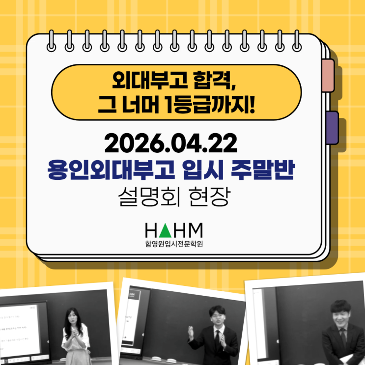 “외대부고 합격, 그 너머 1등급까지” 안녕하세요, 함영원입시전문학원 공식 블로그입니다 지난 4월 22일(수), 함영원입시전문학원에서 중3 외대부고 주말반 설명회가 진행되었습니다. 설명회가 끝난 후에도 개별 상담이 이어질 정도로 현장 반응이 정말 뜨거웠습니다. 그날의 핵심 내용, 지금 바로 정리해 드립니다! 4/22 외대부고입시 대비반 (영수,자소서 주말반) 핵심 내용 요약 현장에서 가장 반응이 뜨거웠던 파트별 핵심 포인트입니다. 많은 학부모님들이 몰랐던 외대부고 영어 내신의 실체, 그리고 중학교 때부터 어떻게 준비해야 하는지의 방향이 공개되었습니다. 단순히 영어를 잘한다고 되는 게 아니었습니다. 설명회 현장에서....... <img src="https://blogthumb.pstatic.net/MjAyNjA0MjZfODIg/MDAxNzc3MTc0MzAwMjc1.cSMUAAYROr69qWW_sUd2xojdoj26wrF19pGAjBWcD7kg.UJUvkfGP24RuFGk6wgZbmUAo_YGfT4FVOK5b01K6UAwg.PNG/1.png?type=s3" />