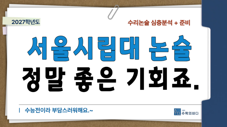 안녕하세요? 수종샘입니다. 오늘은 서울시립대학교 수리논술 전형에 대한 모든 정보 정리해보겠습니다. 오늘 전할 주요 내용은 1) 27 서울시립대 수리논술요약 2) 2026 서울시립대 기출분석 3) 서울시립대 준비할때 알아둘 사항 순으로 작성하겠습니다. 2027 논술요약 전형요약 교과반영방법 26 기출문제 분석 출제단원 26기출의 특징 1) 난도가 상당하네요. 서울시립대는 수리논술 시험의 난도는 대학인지도에 비해 다소 높은 편입니다. 이번 시험도 꽤 어려운 수준으로 출제되었습니다. 대학별 시험의 난도를 평가해본다면 아래와 같습니다. 연세 > 한양 > 서울시립대 = 성균관대 > 서강대 > 중앙대 = 고려대 고려할 사....... <img src="https://blogthumb.pstatic.net/MjAyNjA0MjBfMjYw/MDAxNzc2NjQzODc5NTI4.YwLGxVUxtNgktNdoYux_lBQkEe1N96lqZuuyy_R_6nkg.9lAvWVbagMVkIOmdli0Ry2E7K2F2hmm01KffE_pEKDUg.PNG/%C1%A6%B8%F1%C0%BB_%C0%D4%B7%C2%C7%D8%C1%D6%BC%BC%BF%E4._%2894%29.png?type=s3" />