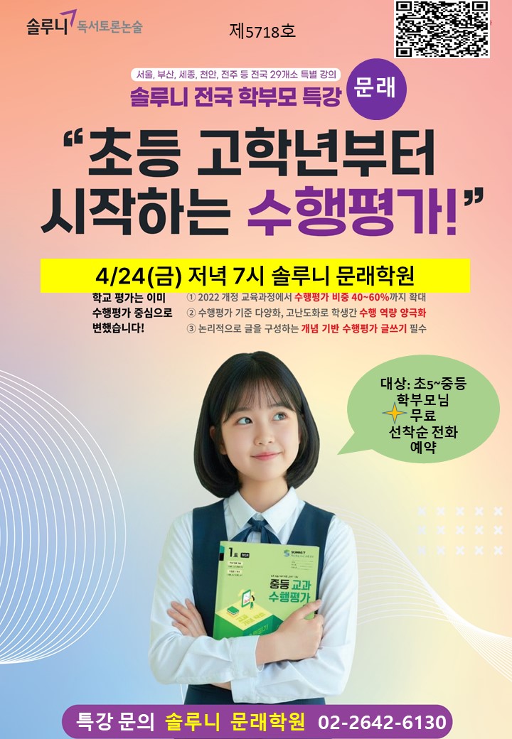 문래학원 학부모 특강 안내드립니다. ■주제: 초등 고학년부터 시작하는 수행평가 ■대상: 초등 5학년~중등 학부모님 ■일시: 4월 24일(금) 저녁 7시 ■장소: 솔루니문래학원 ■내용: -2022 개정 교육과정에서 수행평가 비중 40~60%까지 확대 -수행평가 다양화, 고난도화로 학생간 수행역량 양극화 -논리적으로 글을 구성하는 개념 기반 수행평가 글쓰기 필수 ●2022 개정 교육과정에 맞게 학교 평가도 변화하고 있습니다. 변화의 중심에 서 있는 자녀에게 무엇을 도와줄 수 있을까 고민하는 학부모님은 특강 신청하세요. ●특강 신청은 전화주세요. 솔루니문래학원 02-2642-6130 #수행평가 #중등논술 #학부모특강 #솔루니문래학원 #광명솔루니 #....... <img src="https://blogthumb.pstatic.net/MjAyNjA0MjFfMTIz/MDAxNzc2NzM3ODkwMjMy.FnZ3FpmPyTjccXsbhsZ1XTxOtTVfg1KxVPOMBSa-HIIg.RAtVJviVjTvqZphAh-UWQ5x1LzLehIvxc2ZCRA3TBzMg.JPEG/1776418157554.jpg?type=s3" />