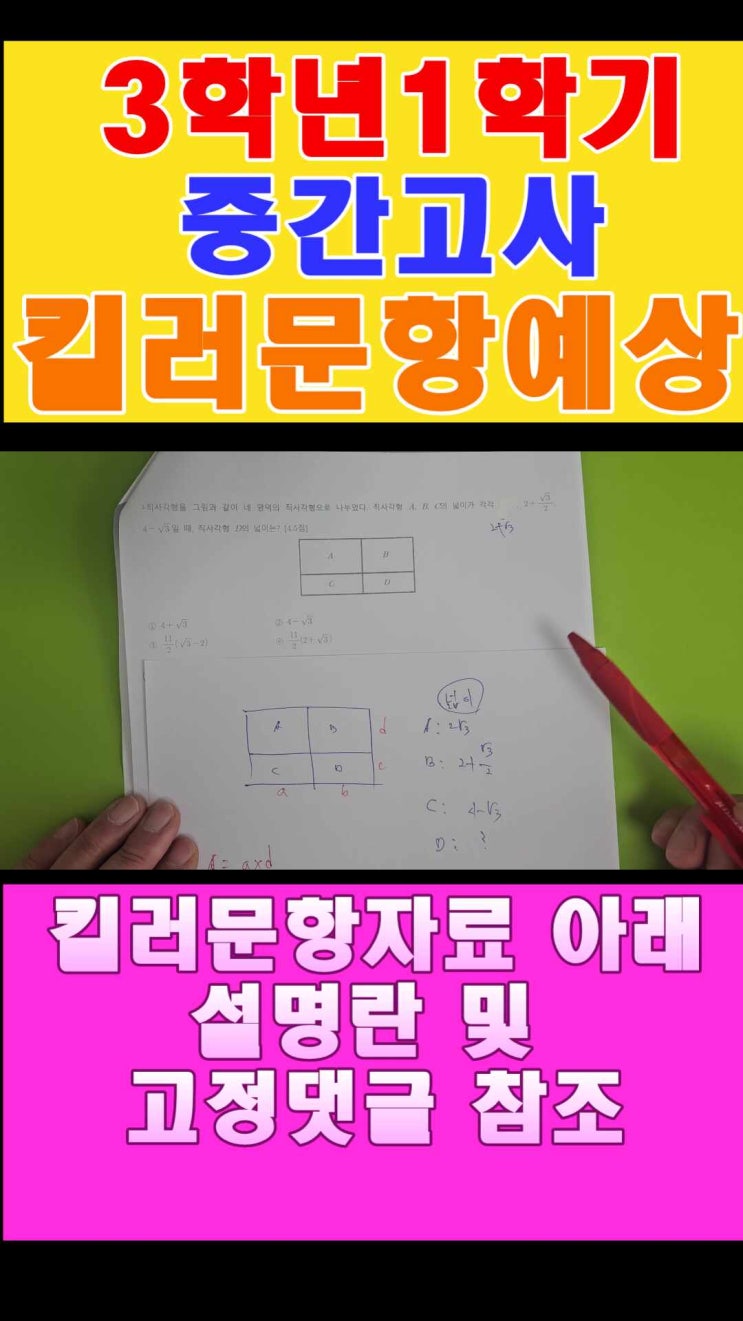 전국의 각 학교의 기출문제중 한문제 한문제 찾아서 만든 자료입니다. 학교의 어려운문제 대비에 도움이 되지않을까 생각합니다. https://open.kakao.com/o/saBv9RPh #킬러문항 #3학년킬러문항 #3학년1학기킬러문항 <img src="https://phinf.pstatic.net/image.nmv/blog_2026_04_21_2612/nyaMb5hhoF_03.jpg?type=f480x480" />