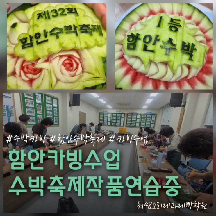 안녕하세요. 최쌤입니다. 매주 화요일 저녁이면 어김없이 모여 집중력 넘치는 시간을 보내고 있어요. 12주간 진행되는 수박카빙 정규 수업이 한창 진행 중인데요, 그 과정 중 약 3회 정도는 5월에 있을 함안수박축제 전시에 출품할 작품을 준비하는 특별 수업으로 운영되고 있어요. 이번 주와 다음 주 수업이 바로 축제 준비를 위한 집중 연습 기간이에요. 단순 체험이 아니라 실제 전시를 목표로 하는 작업이라 수강생분들의 집중도와 열정이 평소보다 한층 더 높아진 분위기였어요. 퇴근 후 저녁 시간임에도 불구하고 모두가 자신의 작품 완성도를 높이기 위해 차분하게 작업에 몰입하는 모습이 인상적이었답니다. 수업이 진행되는 교실 안에는....... <img src="https://blogthumb.pstatic.net/MjAyNjA0MjNfMjQy/MDAxNzc2OTI0MzgyODMy.S0E7-U4jOywoaauDPpEzQhNUiZqlvSc3XnVtzKlVCK8g.q9VTga48uuWVzm0WoZtqZ7Wkax7gY4ixmdn7KkzWDtwg.JPEG/900_20260423150603.jpg?type=s3" />