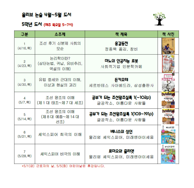 올리브논술 정규반 26.4~5월 학년별 선정 도서 안내