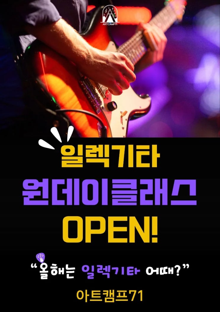 "데이식스(DAY6) 보고 일렉기타 배우고 싶다고 하는데, 토요일 반은 이미 마감됐나요?" "학교 밴드부에서 일렉기타 담당하게 됐는데, 어디서 제대로 배울 수 있을까요?" 아트캠프71 동탄점 401호 실용관 일렉기타 토요일 주말반이 전원 마감되었습니다. 계속되는 문의와 대기생들을 위해 월요일 1:1 전용 클래스를 긴급 증설합니다. 지금 중·고등학생들이 일렉기타에 열광하는 이유 최근 K팝과 밴드 음악의 급부상으로 일렉기타는 청소년들에게 가장 '힙한' 악기가 되었습니다. 학교 축제 무대의 절대 주인공 일렉기타 솔로가 시작되는 순간 무대 위 모든 시선이 집중됩니다. 이 짜릿한 경험은 아이의 자존감....... <img src="https://blogthumb.pstatic.net/MjAyNjA0MTZfMjY3/MDAxNzc2MzIzMDE3ODM3.UC8pvK_awWmnDJp5BeL8Q-z5npFPZC0old-6sfltniAg._XpXz3V7xmtt4EgJQXDKTXvIFd6AGbRa8DDggMFYi9sg.JPEG/900_1757000760801.jpg?type=s3" />