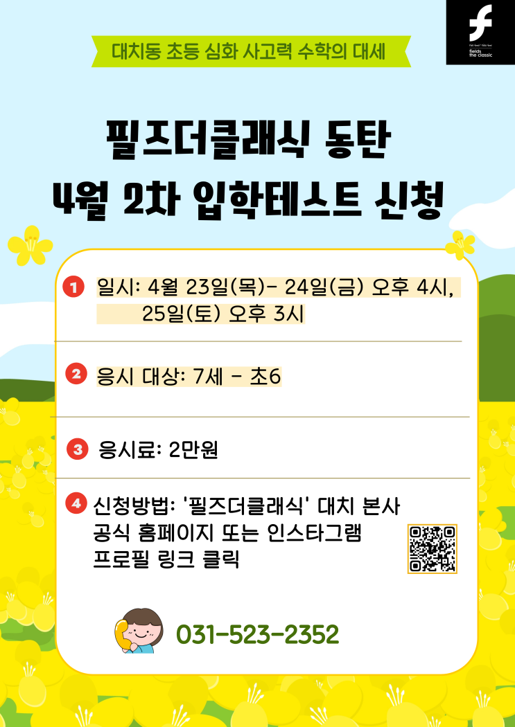 4월 2차 입학 테스트 신청을 오픈 하였습니다.✨ ✔️ 응시 일시: 4월 23일(목), 24일(금) 오후 4시, 25일(토) 오후 3시 ✔️ 응시 대상: 7세(2020년생) - 초6 ✔️ 응시료: 2만원 ✔️ 신청 방법: '필즈더클래식' 대치 본사 공식 홈페이지 또는 아래 링크 클릭 ☎️ 교육 문의: 031-523-2352 ☎ 교육 문의: 031-523-2352 필즈더클래식 동탄센터의 소식을 가장 빠르게 확인 하실 수 있는 공식 인스타그램 계정 안내드립니다. <img src="https://blogthumb.pstatic.net/MjAyNjA0MTdfMjM4/MDAxNzc2NDE1ODEwMjc2.GA5gCsCXtybpxPAxcqSL0_mABJa8EKMXQMWWLfIEi_Eg.k-kSG-bo1M7uD3A1-KURX2APwoK0k2RgVCuWl5kTpGcg.PNG/4%BF%F92%C2%F7%C0%D4%C7%D0%C5%D7%BD%BA%C6%AE.png?type=s3" />