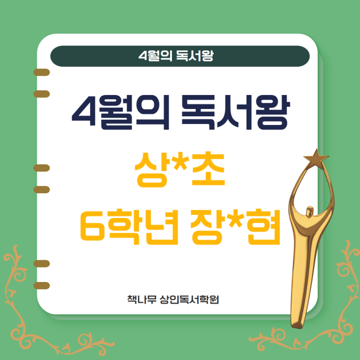 4월의 독서왕은 상*초등학교 장*현 학생입니다.