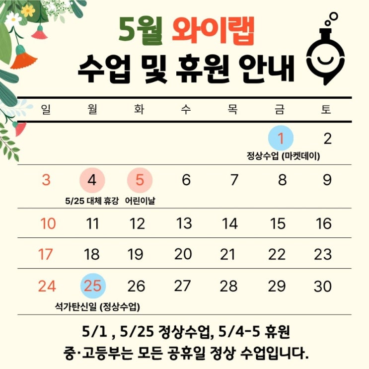 5/1, 5/25 정상수업 5/4 ~ 5/5 휴원 * 중고등부는 모든 공휴일 정상 수업입니다. (*학년별 세부일정은 사진 참고) <img src="https://blogthumb.pstatic.net/MjAyNjA0MjFfMTQw/MDAxNzc2NzQ5NDM3NDYx.ZiAcIMwPdnFDRYqeQ3Xm0dT5m4QEvomOxb50tFiDzPgg.wozW0YlEsm7Lw3jTvL0XW9gvHFuxr78I_WqMhk_08AIg.JPEG/900_1776659478916.jpg?type=s3" />