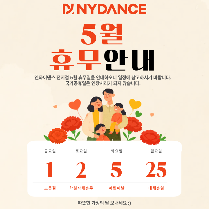 안녕하세요, 엔와이댄스 인천점입니다 다가오는 5월 휴무 일정을 안내드립니다. ✔ 5월 1일(금) 노동절 ✔ 5월 2일(토) 학원 자체휴무 ✔ 5월 5일(화) 어린이날 ✔ 5월 25일(월) 대체휴일 위 일정에는 수업이 진행되지 않으니 이용에 참고 부탁드립니다. 또한 국가공휴일은 별도의 보강이나 연장 처리가 되지 않는 점 양해 부탁드립니다. 따뜻한 5월, 소중한 분들과 함께 행복한 시간 보내시길 바랍니다 감사합니다! ▶ 인스타그램 : @nydance_incheon ▷ 공식홈페이지: http://www.nydance.co.kr ▶ 네이버블로그 : https://blog.naver.com/nydance06 ▷ 네이버TV : https://tv.naver.com/nydance 상담문의 전화 : 032) 543-7775 ....... <img src="https://blogthumb.pstatic.net/MjAyNjA0MjFfMTc0/MDAxNzc2NzU2NjAwMTgz.-Yl5qkaIvjTHBnOpO1SWVSgRPDvB0xIwl74OOoxW808g.mZIr3LSVw4H9QKqL44ed1JRwGuY-04dj6kALI0rYlJUg.PNG/image.png?type=s3" />
