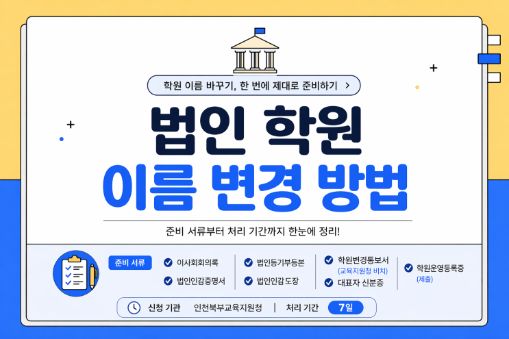 학원을 운영하다 보면 한 번쯤은 학원 이름을 바꿔야 할 일이 생깁니다. 브랜드 이미지를 정리하고 싶을 때도 있고, 종합학원으로 확장하면서 기존 이름이 지금 방향과 맞지 않을 때도 있지요. 실제로 이름 하나 바꾸는 일처럼 보여도, 막상 진행해 보면 생각보다 챙길 것이 꽤 많습니다. 특히 법인으로 운영하는 학원은 서류를 꼼꼼하게 준비해서 가는 것이 정말 중요합니다. 괜히 한 번 갔다가 서류가 빠져서 다시 방문하게 되면 시간도 아깝고 일도 밀리기 쉽거든요. 그래서 오늘은 인천북부교육지원청 기준으로, 법인 학원 이름 변경할 때 어떤 것들을 준비해야 하는지 정리해보려고 합니다. 먼저 방문 전에 준비해야 할 서류부터 보겠습니다....... <img src="https://blogthumb.pstatic.net/MjAyNjA0MjFfOTYg/MDAxNzc2NzU3NjQ4NjM1.AvROHDpp3EdbCz8QZktOveq27Cf_KCzALwLoUbdDYYsg.5LHWb2VzqJqtyaCwQHRHhBrrfjtVxbozEnRvHnKFeGEg.PNG/ChatGPT_Image_2026%B3%E2_4%BF%F9_21%C0%CF_%BF%C0%C8%C4_04_46_45.png?type=s3" />