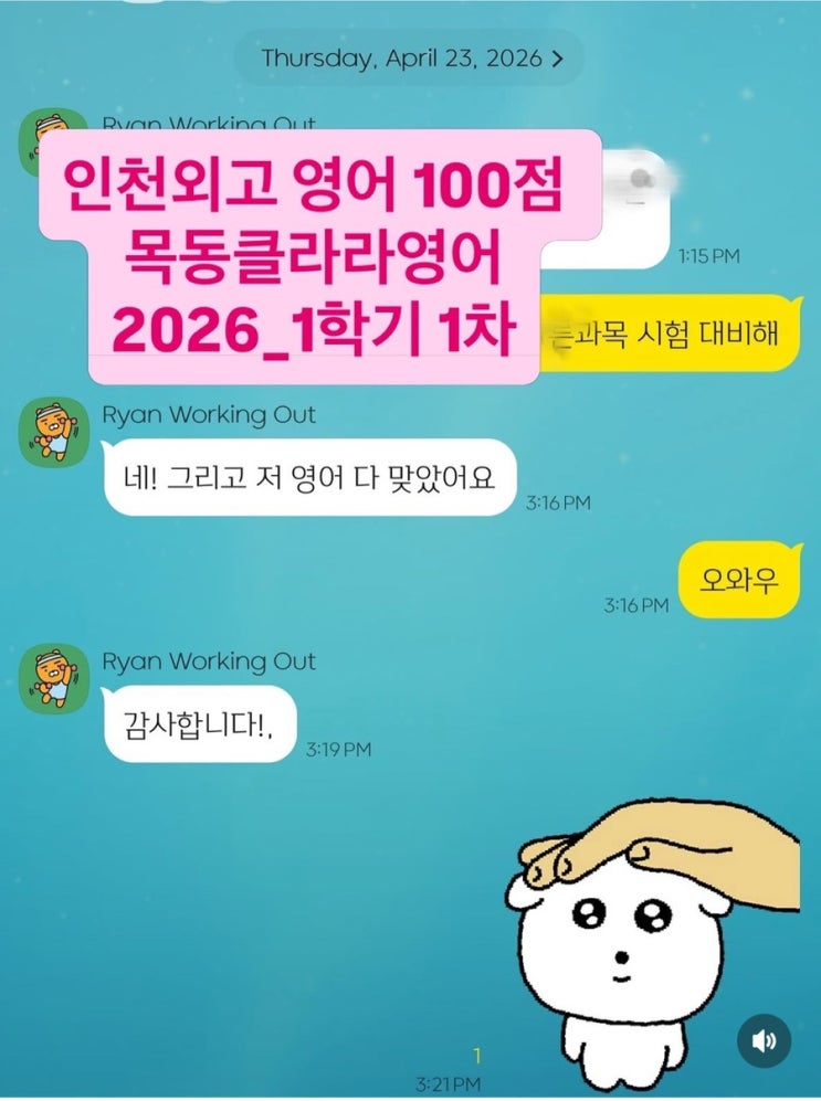 목동클라라영어 중2부터 계속 함께했던 우리학생 인외고가 우리학생 성향에 잘 맞을거라 확신하고 보냈는데 정말 감격스럽네요! 어제밤까지도 출제 예상 문제로 마음졸이며 걱정많았던 우리학생 그동안 하루도 허투루 쓰지않고 노력했던 첫 시험대비결과 힘들었던 모든 순간, 네가 했던 모든노력 밤새지마라 잠은 4시간이라도 자야한다 비타민 먹어가며 버틴 첫 시험 뜨겁게 보낸 우리의 시험기간 너무너무 기특하고 자랑스럽습니다 ~ #특목입시전문 #목동클라라영어 #검단신도시영어 <img src="https://blogthumb.pstatic.net/MjAyNjA0MjNfMTgz/MDAxNzc2OTM2MjE0MDIw.tCexPxPjpvMNeuA5JvWJnf3i6fWTuOaKHMlX_GawRy8g.4IqQs8PGXqeY463gRWlC9egXJvmatken7e44Om3tT9og.JPEG/output%A3%DF1514369156.jpg?type=s3" />