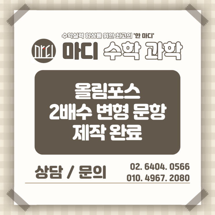 안녕하세요. 마디 수학과학입니다 이번 중간고사부터는 휘경여고 학생들의 성적 향상을 위해 정말 많이 준비했습니다. 조금 표현이 과할 수도 있지만, 이번 시험은 선생님들도 꽤 이를 갈고 준비했습니다. 이번 휘경여고 부교재는 EBS에서 출간된 올림포스 교재입니다. 올림포스는 Level 1, Level 2, Level 3로 구성되어 있는데, 처음에는 비교적 잘 풀리다가도 Level 2부터는 갑자기 막히는 문제들이 반드시 생깁니다. 실제로 학생들도 여기 구간에서 시간을 많이 쓰거나, 풀이 방향을 못 잡는 경우가 자주 있습니다. 그런데 휘경여고 시험은 특징이 분명합니다. 여러 교재를 많이 푸는 것보다 부교재를 얼마나 정확하게 반복했는지가....... <img src="https://blogthumb.pstatic.net/MjAyNjA0MThfMTU1/MDAxNzc2NTAwNzg2Mzky.q9HzbD202J4x6tBrFDxlKb4wb1Awro8BYcr-h67QpyAg.b57l6fW73-7vIl7fsz_fdG9JzFEmjIj-4iE__B-AD_Ig.PNG/%B8%B6%B5%F0_%C0%E5%BE%C8_%C0%A7%B7%CA_%BD%E6%B3%D7%C0%CF.png?type=s3" />