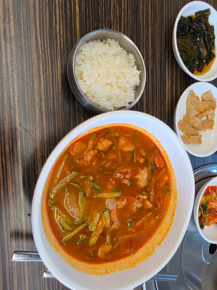 (내돈내산 리뷰입니다. 찐 동네 탐방기) 오랫만에 점심에 여유가 생겼어요... 3월 말부터 준비한 중간고사 대비 감기 몸살 + 운동까지...4월이 어찌 지나간지도 모르게 바쁘다가 오늘 드디어 시험 직전 보강도 없고 느즈막히 5시까지 출근이라~~ 점심은 외식으로 했습니다. 동네에 점심 식사 메뉴가 늘어난거 같아서 골라먹는 재미가 있네요. 오늘은 남도학하식당에 가서 애호박찌개와 황태해장국으로 골랐습니다. 애호박찌개가 뭔지 궁금하기도 했어요... 경상도에는 없는 음식인지... 전 살면서 먹어본적이 없거든요. ㅎㅎ 요요 미역 장아찌 제 원픽!! 물김치도 시엄니가 담아주시던거와 비슷한 맛이 나서..그릇째 들고 마시고 싶던걸 참아봅니....... <img src="https://blogthumb.pstatic.net/MjAyNjA0MzBfMTc0/MDAxNzc3NTU3MzA0NDg3.0iJdHNnA1sUymljNs2of7kMr8sqFbJhDBYXomdXxhl8g.QZw_e4J_5H5VpLTI1Ha8yGl3aBMUSdx-d45eRu6C4t8g.JPEG/900_20260430_123615.jpg?type=s3" />