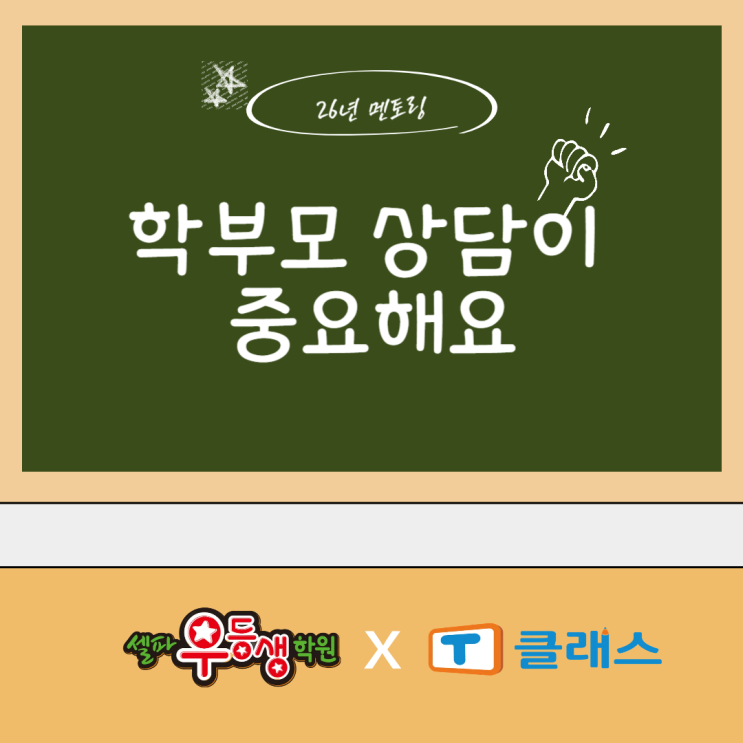 안녕하세요? 꼼꼼한 정쌤입니다. 지난 금요일에 멘티 원장님들과 한자리에 모여 멘토링을 진행했습니다. 원장님들을 맞을 준비가 됐습니다. 동암 원장님이 예쁜 과일까지 준비해 주셔서 더 풍성한 모임이 되었습니다. 학부모와의 소통 및 상담에 대해 나누었습니다. 학부모와의 상담이 왜 중요할까요? 초등학생 학부모 상담은 학생의 성장과 학부모와의 신뢰를 동시에 관리하는 과정이기 때문에 중요합니다. 준비된 자료, 긍정적인 언어, 지속적인 피드백이 상담의 성공을 좌우합니다. 상담 중 대화법 경청과 공감: 학부모의 이야기를 끝까지 듣고, 감정을 존중하는 태도를 보여줍니다. 구체적이고 사실 기반 대화: “집중력이 부족하다” 대신 “....... <img src="https://blogthumb.pstatic.net/MjAyNjA0MTFfMjQy/MDAxNzc1ODgzMTk2NTA3.29gzQL2sQdZjo0s9KYH5P_sHIadj99oojUluKEEbSYMg.M0Gyu54HMxBK7B_NtypyWV3tnCTWfTA5IAJIauhpEbEg.PNG/26%B3%E2_%B8%E0%C5%E4%B8%B52.png?type=s3" />