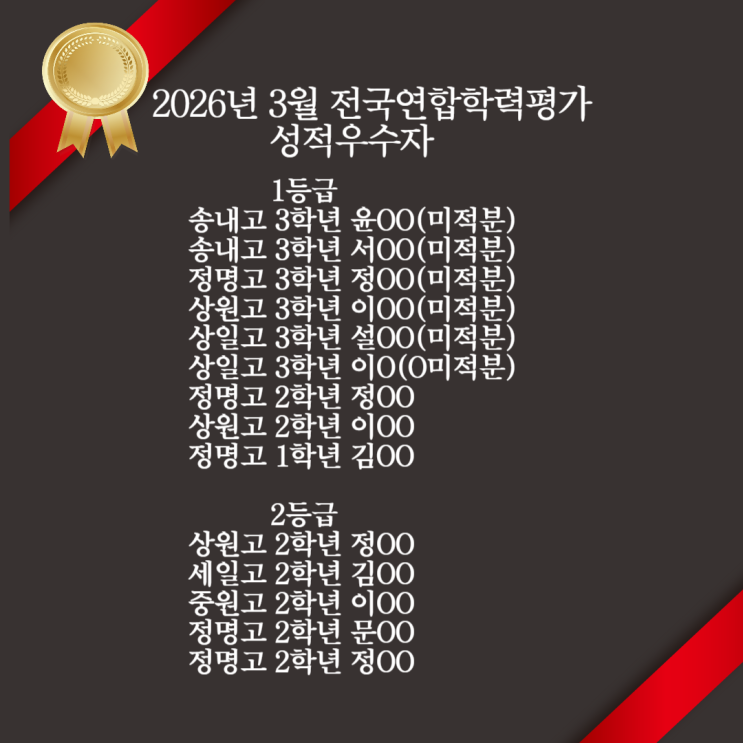 2026년 3월 말에 치른 전국연합학력평가 결과 상일고 3학년 이OO 학생이 해당학교 전교 1등을 했습니다. 이 학생의 경우 학년이 올라갈수록 급격한 성적 향상을 보이고 있습니다. 또한 정명고 고2 학생의 경우 고1 수학 모의고사 성적대비 100등 이상 향상된 47등을 기록했고(학교 등수 기준), 상동고 고3 학생(확통 선택)의 경우도 100등 이상 올라 전교 6등을 했습니다. 개인 지도를 하는 학원 특성상 대형 학원처럼 1, 2등급 학생 수가 많지는 않으나 그 비율은 타 학원에 비해 압도적으로 높습니다. 고1, 고2 학생들의 경우는 6월 이후에 치르는 전국모의고사가 현재의 실력을 판단하는 객관적인 지표가 될 것입니다. 다만 중간고사와 기말고....... <img src="https://blogthumb.pstatic.net/MjAyNjA0MTlfMTE5/MDAxNzc2NTkwOTk5OTM1.lUW31NoT3cpd85JsndUDYSpSPnSooMyC7gvKclc9Jncg.fQEkpGpfiMiTYpk02ydrdQr8calDBA8W6fIFQrHqz5Yg.PNG/%C1%A6%B8%F1%C0%BB_%C0%D4%B7%C2%C7%D8%C1%D6%BC%BC%BF%E4_-001.png?type=s3" />