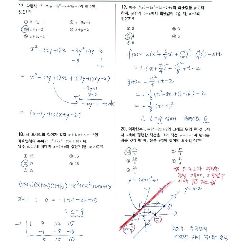 안녕하세요! 부천 상동 서울탑수학학원입니다. 2026년 중간고사를 대비하여, 작년 2025학년도 작전고등학교 1학년 1학기 수학 중간고사 기출문제를 완벽하게 분석해 드리겠습니다. 이번 분석을 통해 시험 범위와 난이도를 파악하고, 다가올 시험에서 고득점을 선점하시기 바랍니다. 1. 시험 범위 및 난이도 총평 시험 범위: 다항식의 연산~이차함수의 활용 난이도: 중상 기본 개념을 묻는 문항부터 계산 과정이 복잡한 응용 문항까지 고르게 출제되었습니다. 특히 복소수 성질과 이차함수의 최댓값·최솟값을 활용한 문항들이 변별력을 가르는 핵심 포인트였습니다. 2. 주요 유형 분석 다항식과 나머지 정리: 다항식의 나눗셈과 나머지 정리를 활....... <img src="https://blogthumb.pstatic.net/MjAyNjA0MjBfMjM1/MDAxNzc2NjY0OTY0MzU1.Ld9GYkFt3uw93jS_d7LGM_HZ9vnPrDdZ5gZEanv1Xsgg.DJVpxtfLD0cG1Hwdb2gqllZ6JDDFeBZToF9T1MkbSKIg.PNG/image.png?type=s3" />
