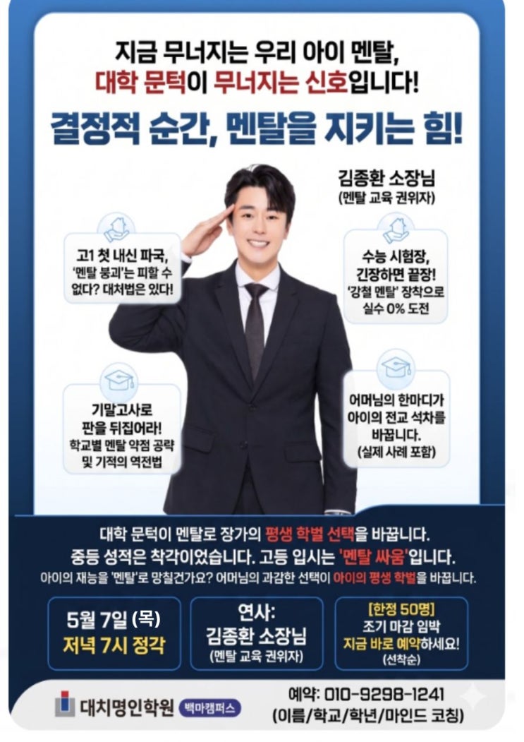 결정적 순간, 멘탈을 지키는 힘! 학부모 초청 특별 강의 안내 결정적 순간, 멘탈을 지키는 힘! 학부모 초청 특별 세미나 안내 학부모님 안녕하세요, 대치명인학원 백마캠퍼스입니다. "중등 성적은 착각이었습니다. 고등 입시는 '멘탈 싸움'입니다." 고등학교 첫 내신 시험을 치르고 난 후, 혹은 중요한 모의고사를 앞두고 우리 아이들의 멘탈이 크게 흔들리는 것을 자주 보시게 될 것입니다. 때로는 억눌린 학업 스트레스로 인해 부모님께 예민하게 굴거나 반발하는 아이를 보며 어떻게 마음을 다잡아주어야 할지 막막하실 때도 있으실 겁니다. 대학의 문턱은 결국 '결정적 순간에 멘탈을 얼마나 단단하....... <img src="https://blogthumb.pstatic.net/MjAyNjA0MjVfMjIw/MDAxNzc3MTE0MTMwNjUy.0BdZRtGpaKr85_MfdLqojfQvvN1jA_S_CLQsXCzuEFog.mq_r88YALpV5gGCuYxD08yp7kskLSENI7h6kJENzIv4g.JPEG/%C1%A6%B8%F1%C0%BB_%C0%D4%B7%C2%C7%D8%C1%D6%BC%BC%BF%E4._%2813%29.jpg?type=s3" />