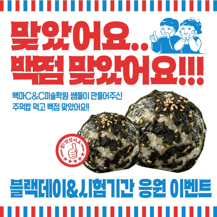 안녕하세요 백마씨앤씨미술학원입니다.^^ 어느덧 4월 마지막 주 주말인데, 우리 학생들에게는 시험기간이지 않을까 싶어요! 4월 중순부터 중고등학교의 1학기 첫 지필 고사가 시작되는데 즐겁기만 했던 새 학기의 분위기가 조금씩 달라지는 시기인데요~ 그런 우리 학생들을 위해 이번 시험 기간과 겹쳐지는 블랙데이를 맞이하여 열심히 공부하고 있는 학생들을 응원해 주고자 맛있는 주먹밥을 만들어주는 이벤트를 진행해 보았어요~ 새까만 김을 야무지게 코팅한 백마C&C미술학원만의 주먹밥! 선생님들의 사랑을 가득 담아 만들어줘볼게요~ㅎㅎ 우선 주재료인 밥에 단무지와 소금, 참기름을 더해 밑간을 해주고요! 핵심 재료인 참치+마요네즈....... <img src="https://blogthumb.pstatic.net/MjAyNjA0MjVfNjgg/MDAxNzc3MTA2NTkyMTg2.MZCO90EoA2QgxnkjCGuP8RnNUyjkh4A5V4iqLb31OK4g.feRw4nxxQoyDNxPZ-23EIXCya7115E6ZB4v7r-G9Tusg.JPEG/%C1%A6%B8%F1%C0%BB_%C0%D4%B7%C2%C7%D8%C1%D6%BC%BC%BF%E4._%2815%29.jpg?type=s3" />